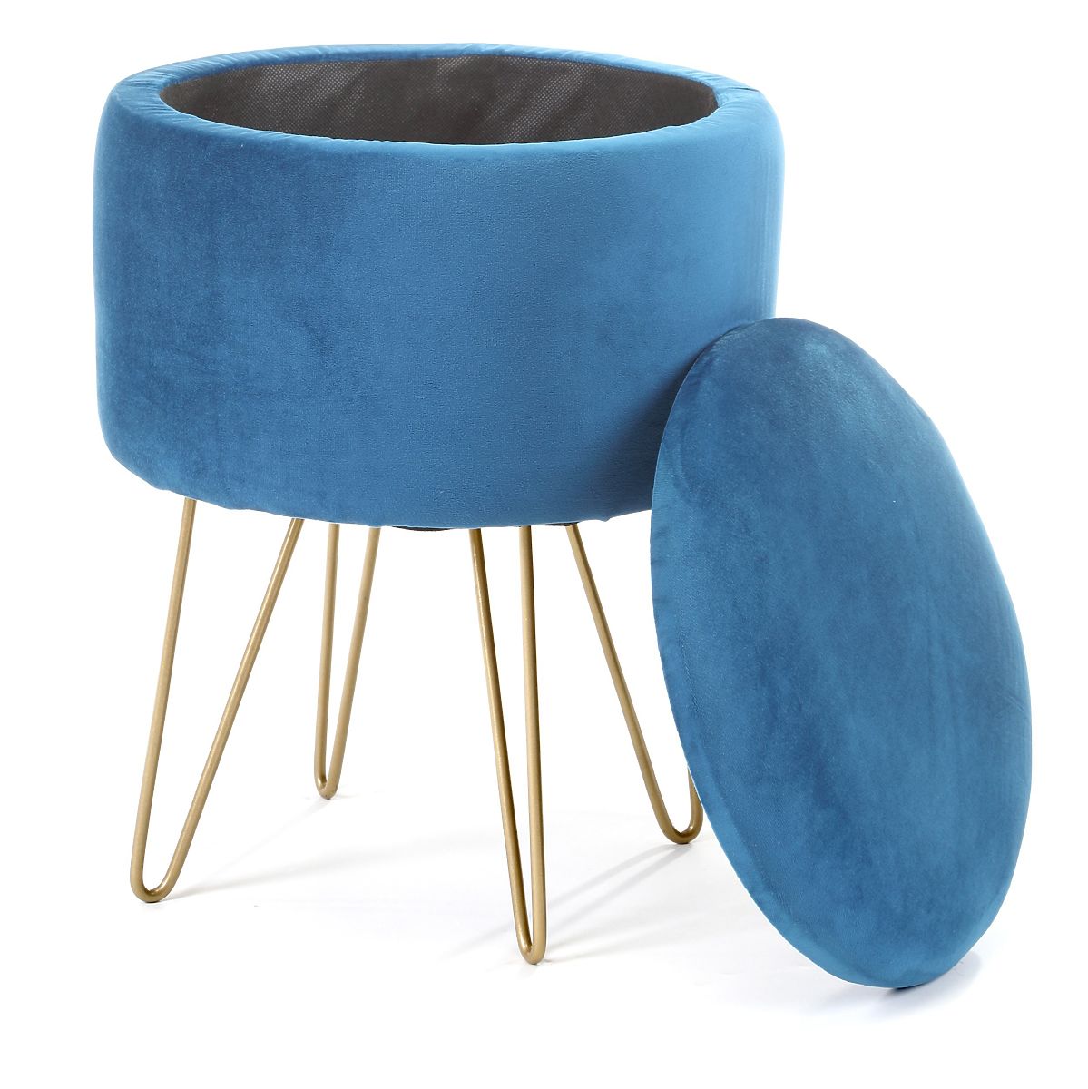 Kék puff tárolóhellyel, aranyszínű fém lábakon.