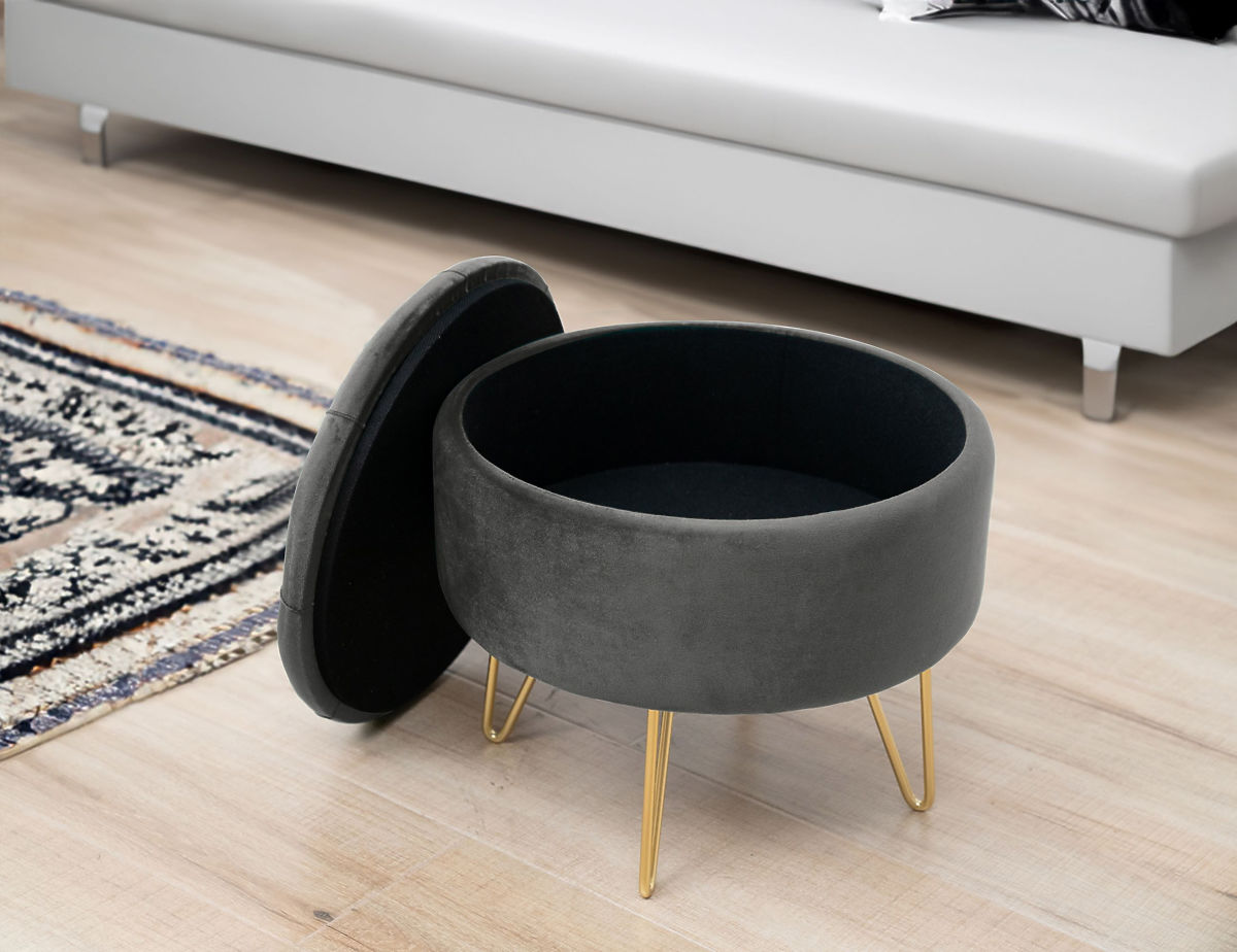 A lábtartó vagy puff remek kiegészítő a nappaliba vagy a hálószobába. Segítségével a fáradt lábak pihenhetnek egy hosszú nap után, és ha a puff puha velúrból készült, az csak fokozza a pihenés kellemes érzését. A modern megjelenést arany színűre festett fém lábak egészítik ki, ami idén annyira divatos. A nyitható fedél hozzáférést biztosít a tárolóhelyhez, ahová a mindennapi használatra nem szükséges tárgyakat helyezhetjük.Specifikációk: