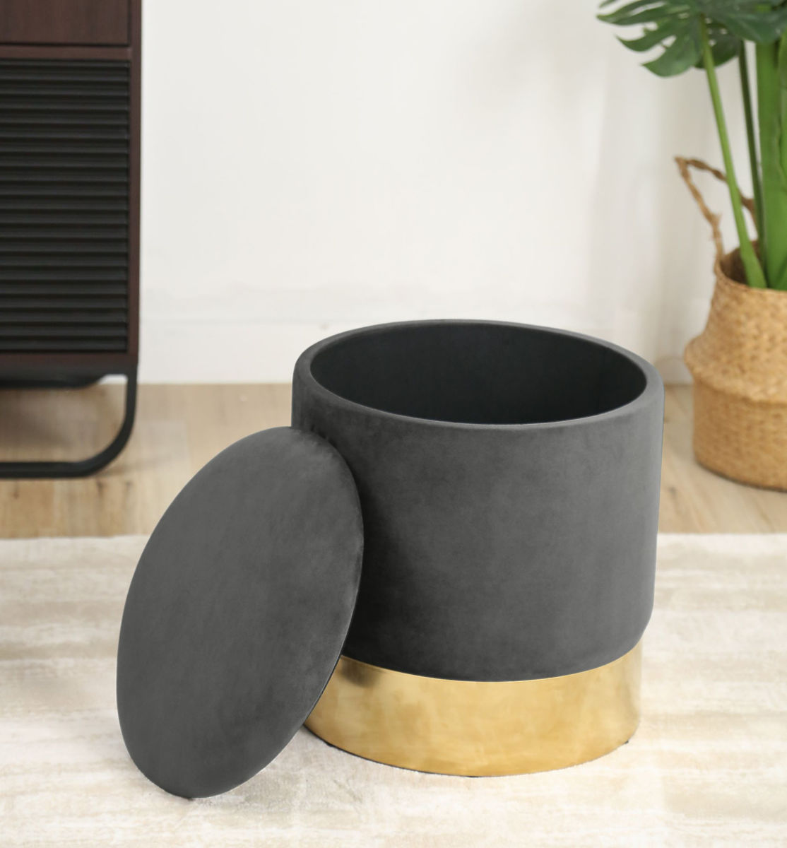 Tárolóval ellátott puff aranyszínű fém alapon.