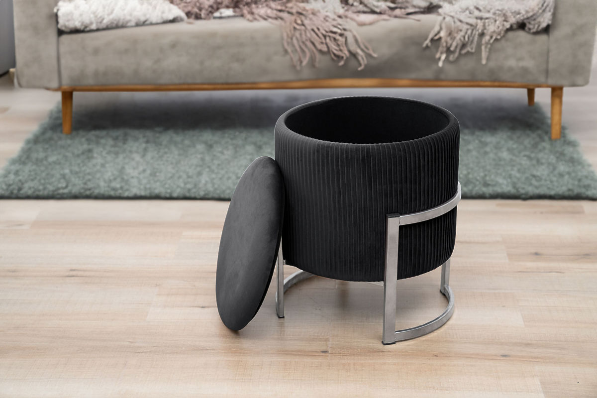 A lábtartó vagy puff remek kiegészítő a nappaliba vagy hálószobába. Segítségével a fáradt lábak egy hosszú nap után megpihenhetnek, és ha a puff puha velúrból készült, az csak fokozza a pihenés kellemes érzését. A modern megjelenést részletek egészítik ki, puffunkban ezüst színű fém alapot használtunk. A nyitható fedél hozzáférést biztosít a tárolóhelyhez, ahová a mindennapi használatra nem szükséges tárgyakat helyezhetjük el.Specifikációk: