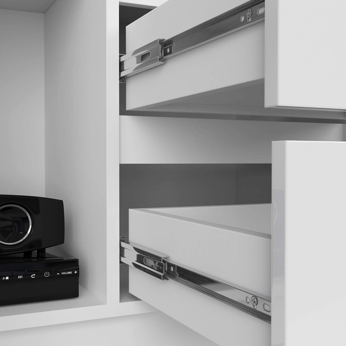 - A fiókok fém golyóscsapágyas síneken mozognak, kihúzásgátlóval