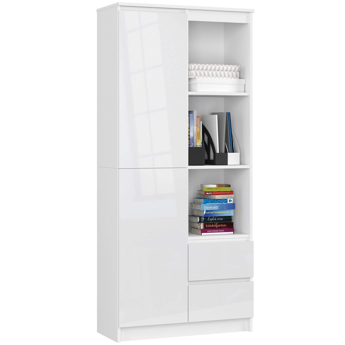 Fehér színű irodai polc ajtókkal és fiókokkal, elülső felületei fényes fehér.