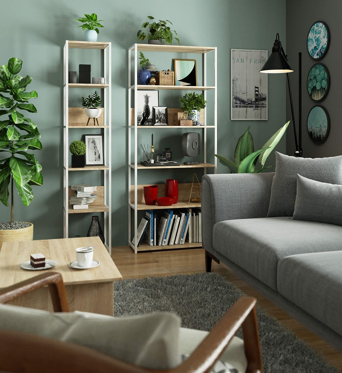 Fém loft polc 6 sonoma tölgy színű polccal és fehér vázzal. .. többet