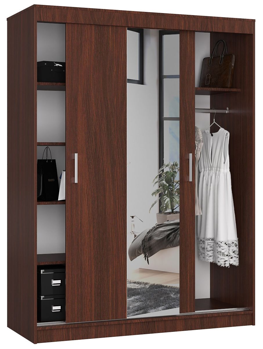 A 150 cm-es CLP tolószekrény tükörrel, wenge színben, egy nagyon érdekes és ami még fontosabb, praktikus bútordarab, amely kiterjedt helyet biztosít különféle dolgok rendezett tárolására. Klasszikus és elegáns megjelenésének köszönhetően tökéletesen illeszkedik számos belső térbe, függetlenül azok jellegétől. Ez a szekrény modell sikeresen használható hálószoba, gardrób, előszoba vagy akár nappali berendezés részeként is. Minden az egyéni preferenciáinktól függ.