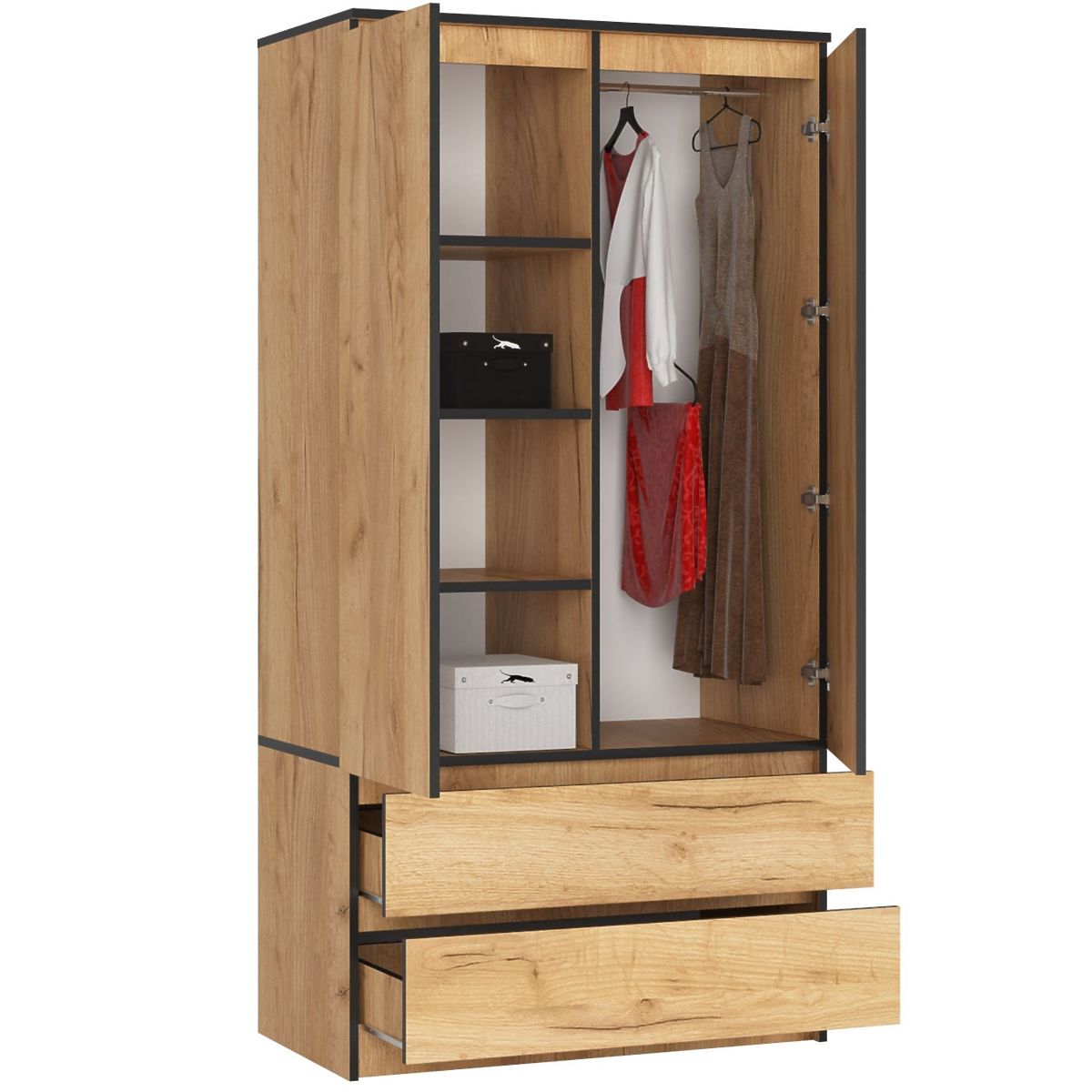 A kétszárnyú ruhásszekrény tartós laminált lemezből készült. A bútor korpusa teljes egészében Craft tölgy színű. A szekrény alsó részét két, egymás felett párhuzamosan elhelyezkedő fiók alkotja, míg a felső, magasabb szegmens két részre van osztva. A bal oldalon 4 polc található, míg a jobb oldalon, amely rúdra van felszerelve, ruhák felakasztására szolgál.