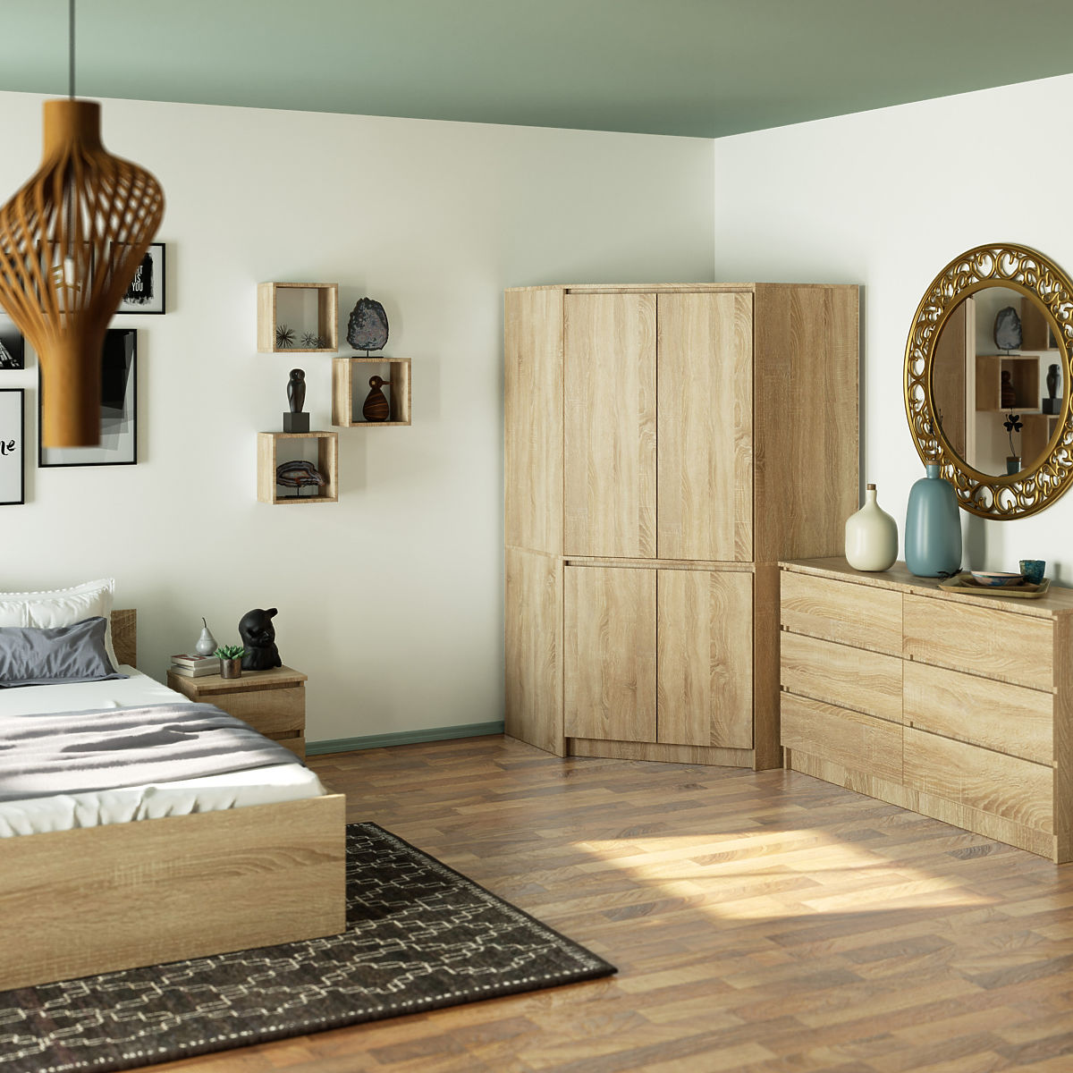 A négyrészes ruhásszekrény tartós laminált lapból készült. A bútor korpusza teljesen sonoma tölgy színű. Rúddal és 6 polccal van felszerelve, ami sok tárolóhelyet biztosít.