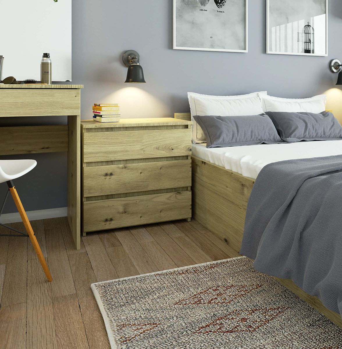 Az artisan tölgy komód 3 könnyen nyitható fiókkal rendelkezik. Tökéletesen illik a hálószobába, mint annak elengedhetetlen eleme. A fiókokba fehérnemű, kozmetikai kiegészítők vagy tartalék ágynemű tárolható. A felső lap ideális éjjeli lámpa elhelyezésére és érdekes olvasmányok tárolására. A bútort elhelyezhetjük a gyerekszobában vagy a tinédzser hálószobájában is.