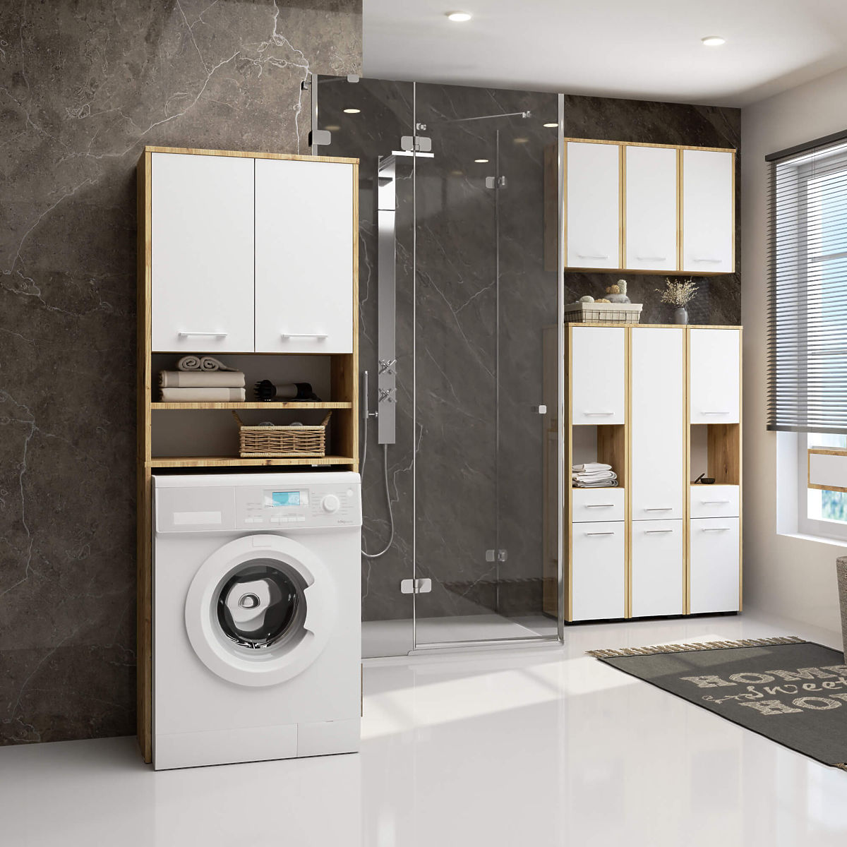 Mosógép fölé helyezhető fürdőszobai szekrény, artisan tölgy és fehér színben. .. többet