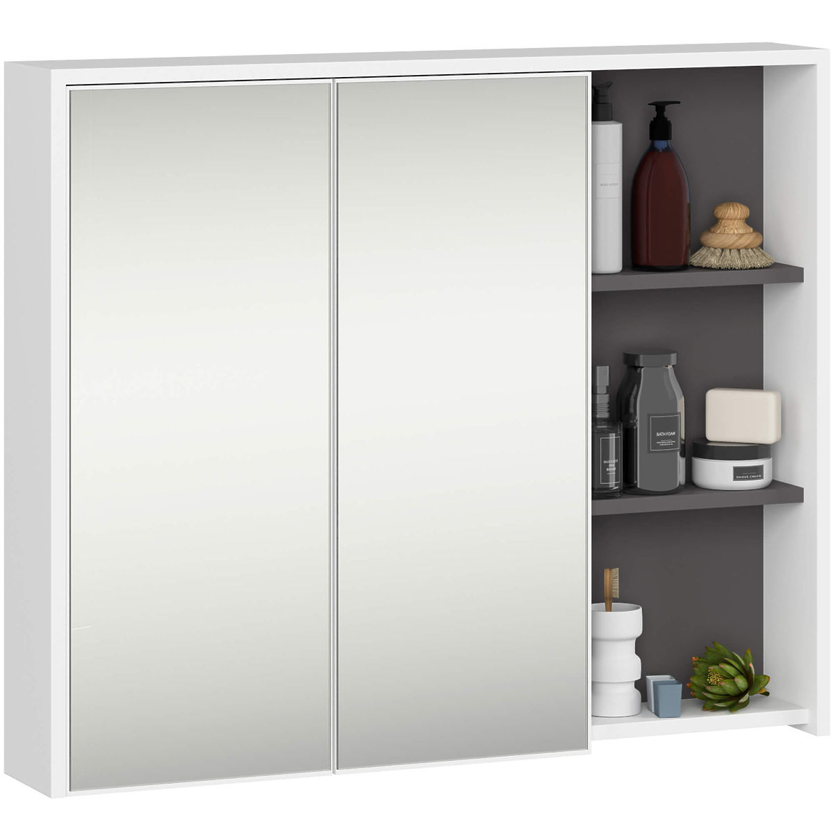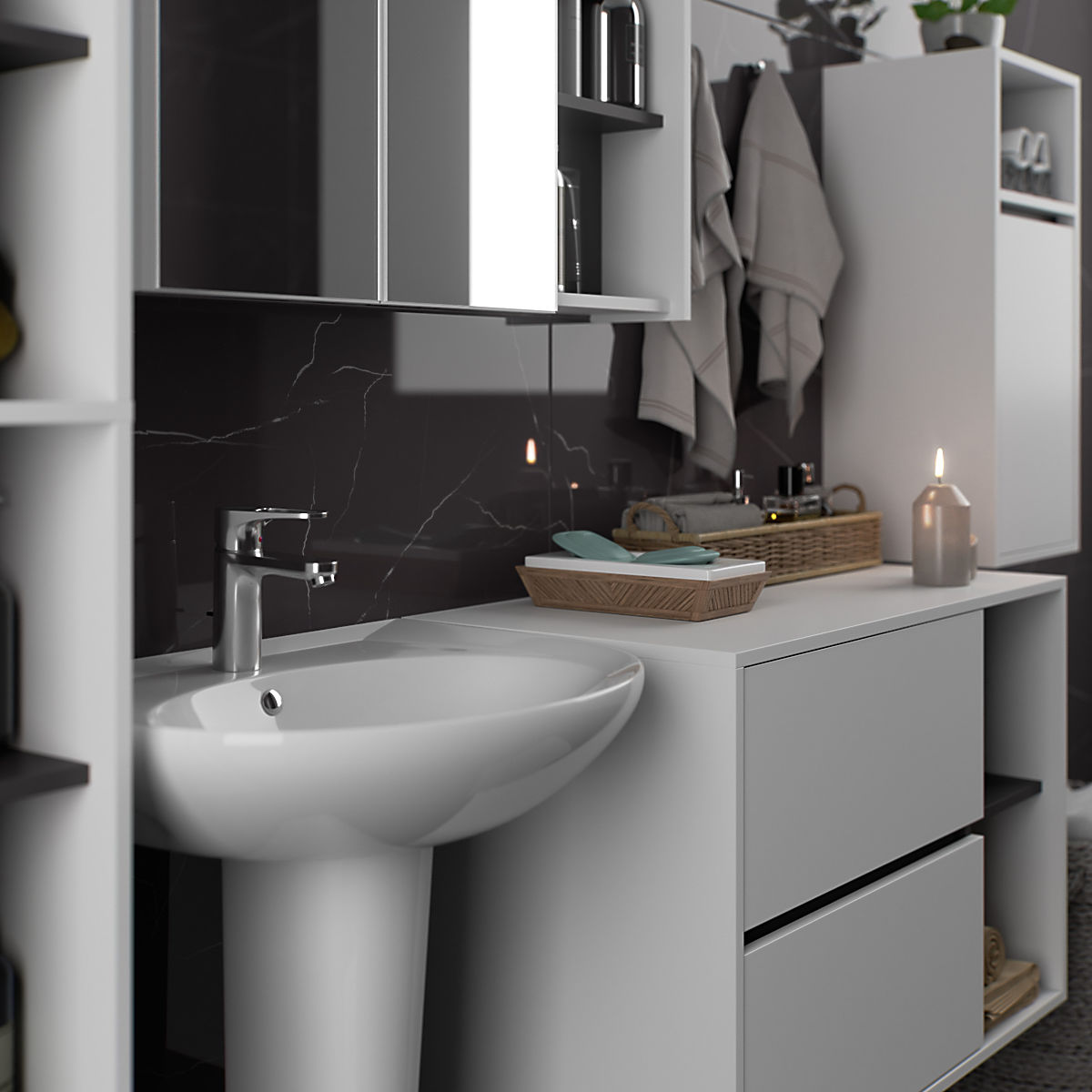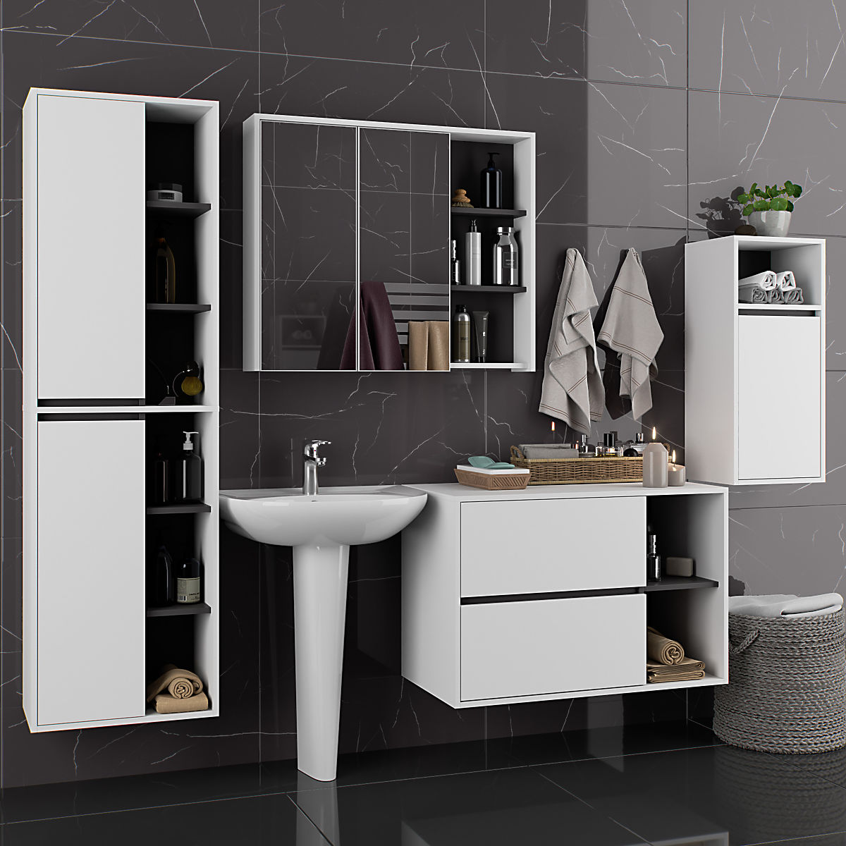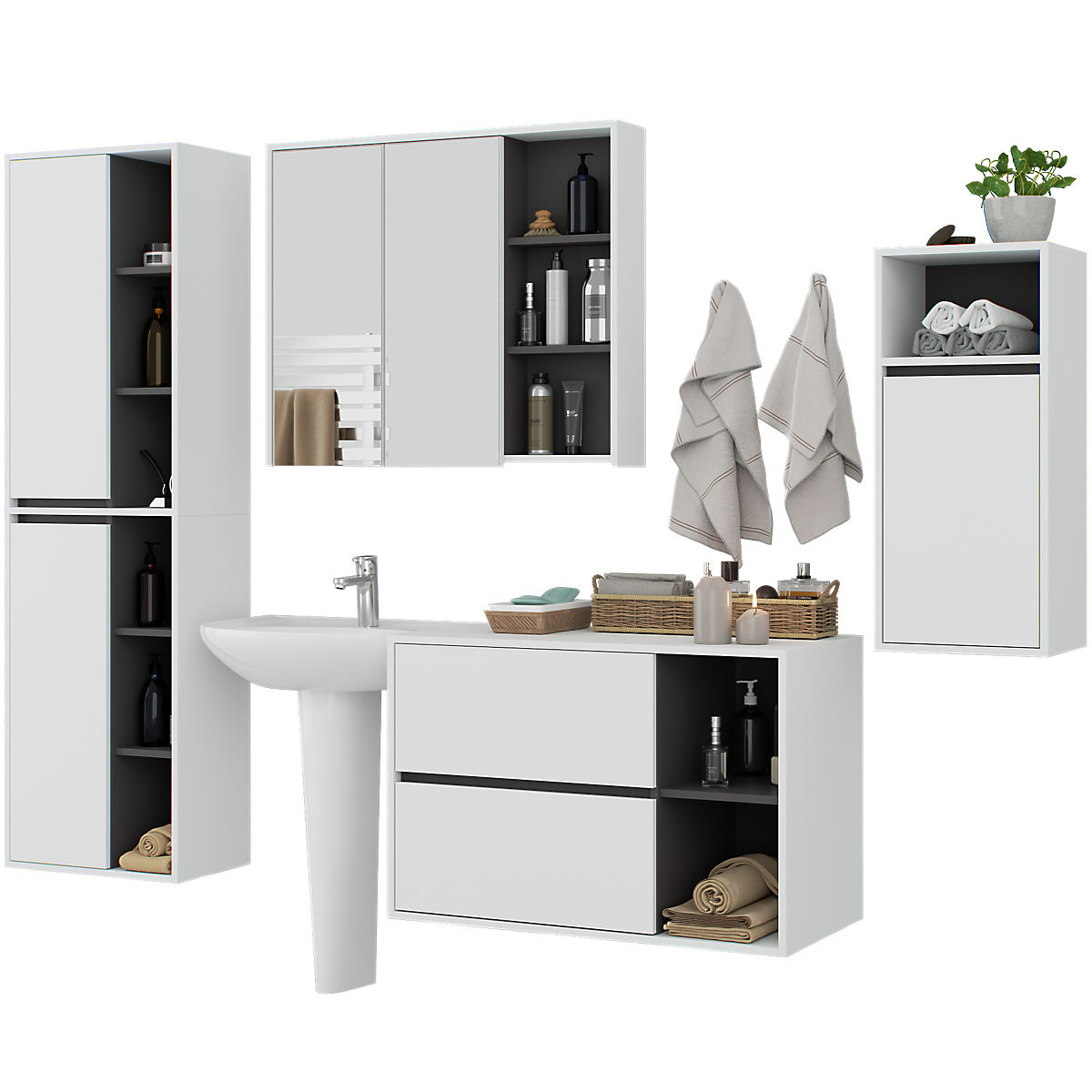 A szekrények függetlenek, így bármilyen konfigurációban és távolságban elrendezhetők az igények szerint. Az ár csak a fürdőszobai szekrényekre vonatkozik, a dekorációs elemek nem részei a szettnek.