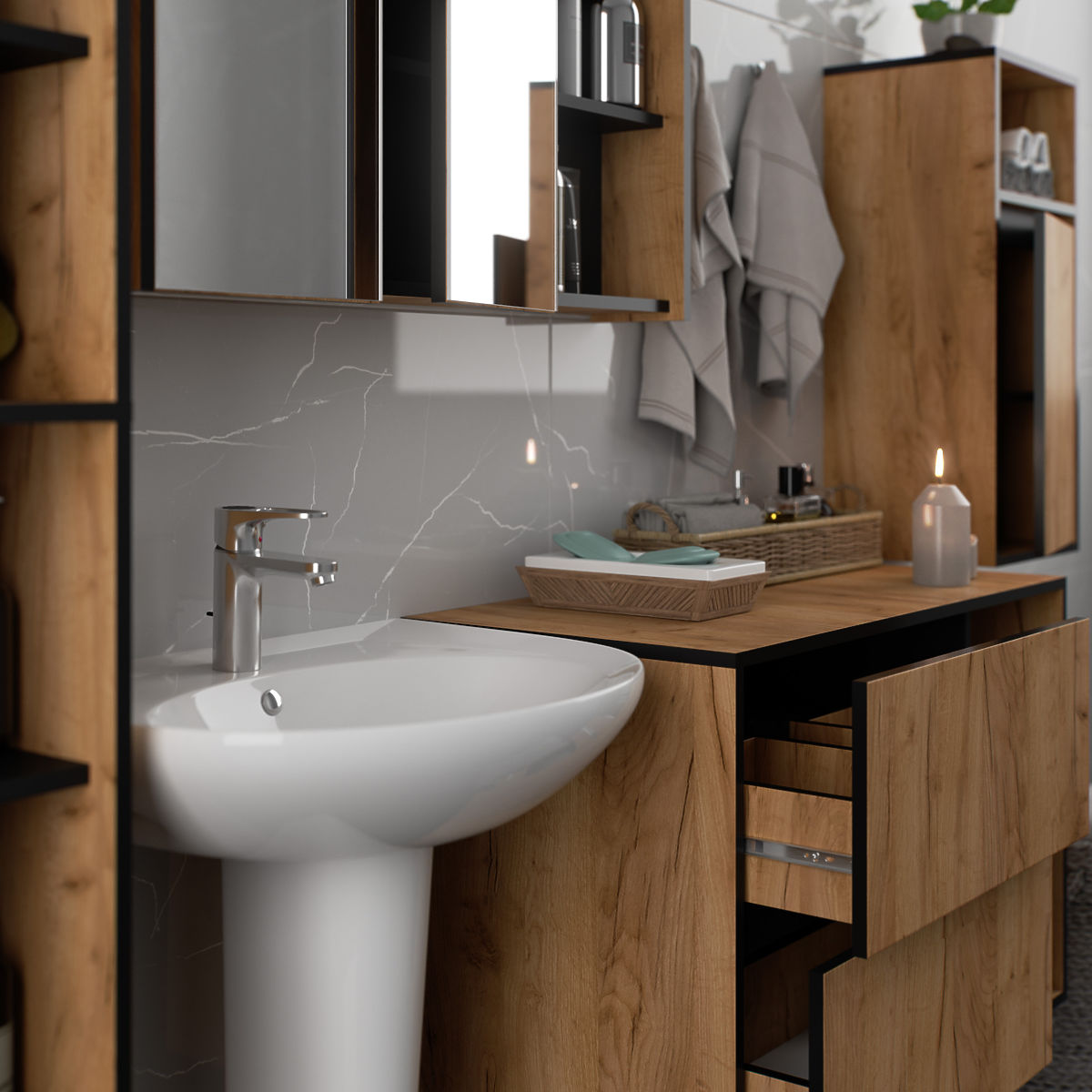 A VAMI fürdőszobai bútor szett a modern stílus kvintesszenciája. A nyitott polcoknak köszönhetően a szekrények vizuálisan könnyedek, és tökéletesen illeszkednek a legújabb dizájntrendekhez. A VAMI fürdőszobai bútor jelentős zárt tárolóhelyet is kínál tisztítószerek, fürdőszobai kellékek és kozmetikumok számára. A szett tartalmaz egy mosdó alatti függő szekrényt lappal, 2 fiókkal és 2 nyitott polccal (W90), egy függő szekrényt 1 nyitott polccal W35, egy magas függő szekrényt W50 6 nyitott polccal és egy tükrös függő szekrényt 3 nyitott polccal W90. Összességében színben és stílusban is egységes, ami harmonikus megjelenést kölcsönöz a szettnek. A mosdó alatti szekrény formázott fiókokkal rendelkezik, amelyek lehetővé teszik a szifon és a hidraulikai elemek felszerelését. A szett tartalmazza: