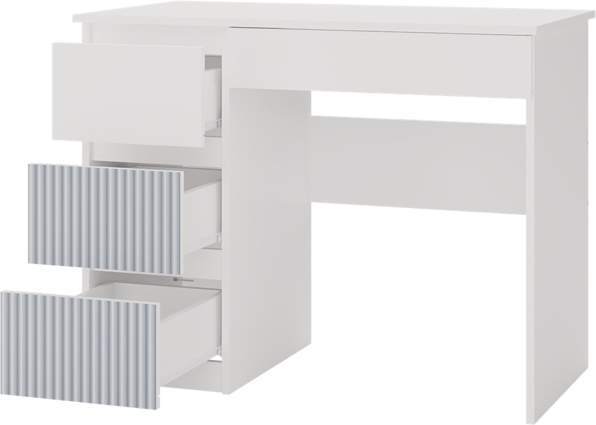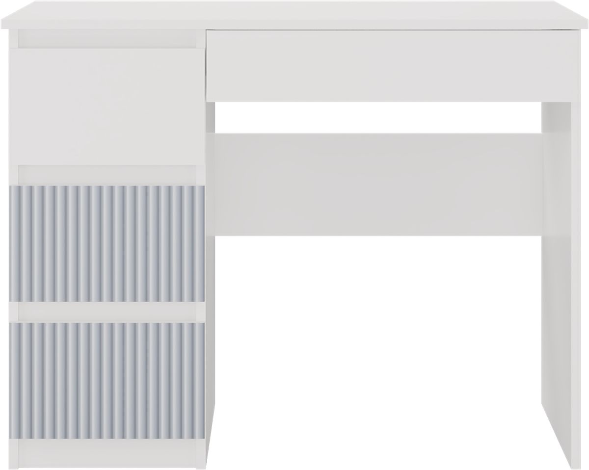 - 3 tágas, magas fiók bal oldalon (ebből 2 kék mintával) és 1 alacsony a jobb oldalon az asztallap alatt