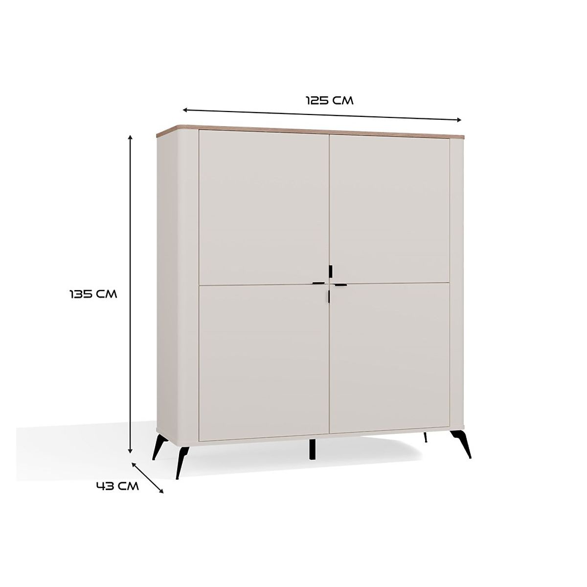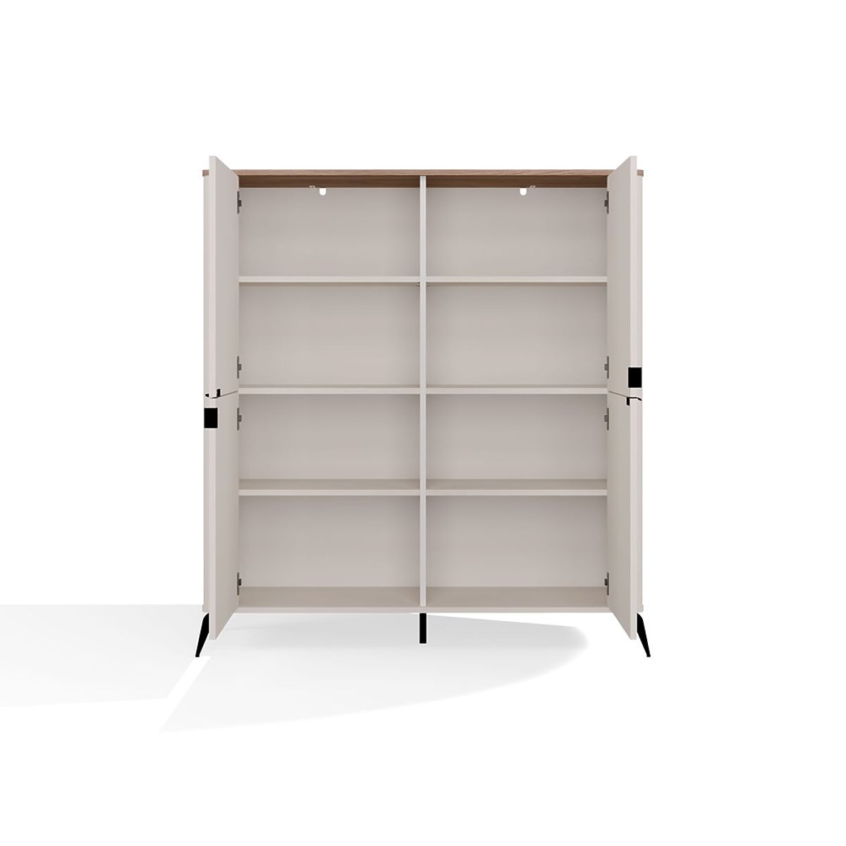 A modell négy csendes záródású ajtóval van felszerelve, amelyek mögött nyolc praktikus polc található – ideális könyvek, dokumentumok, textíliák vagy mindennapi kiegészítők tárolására.
