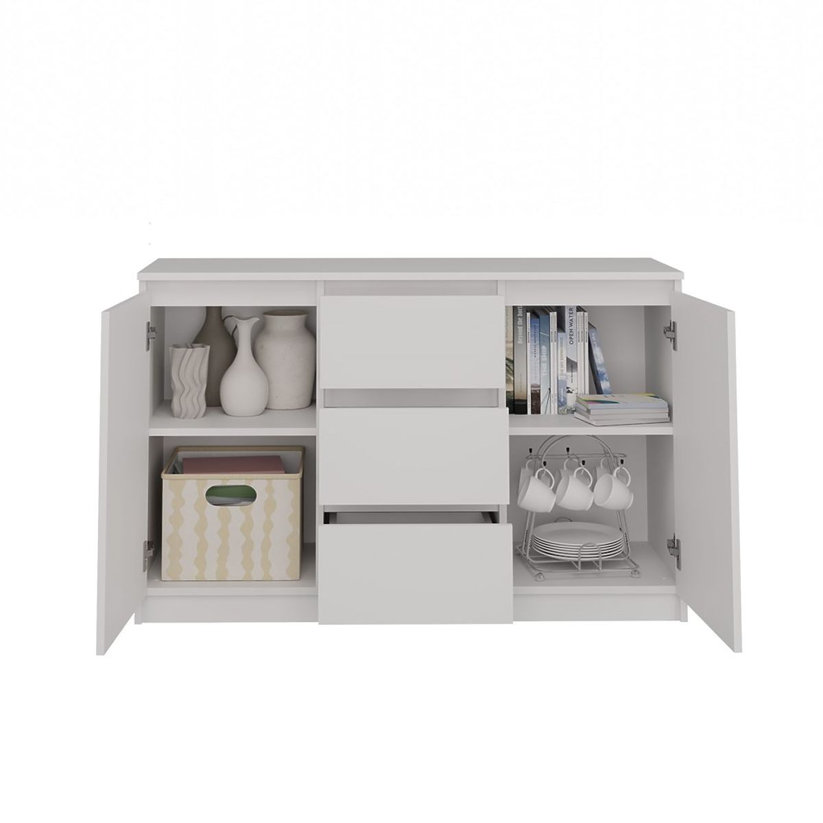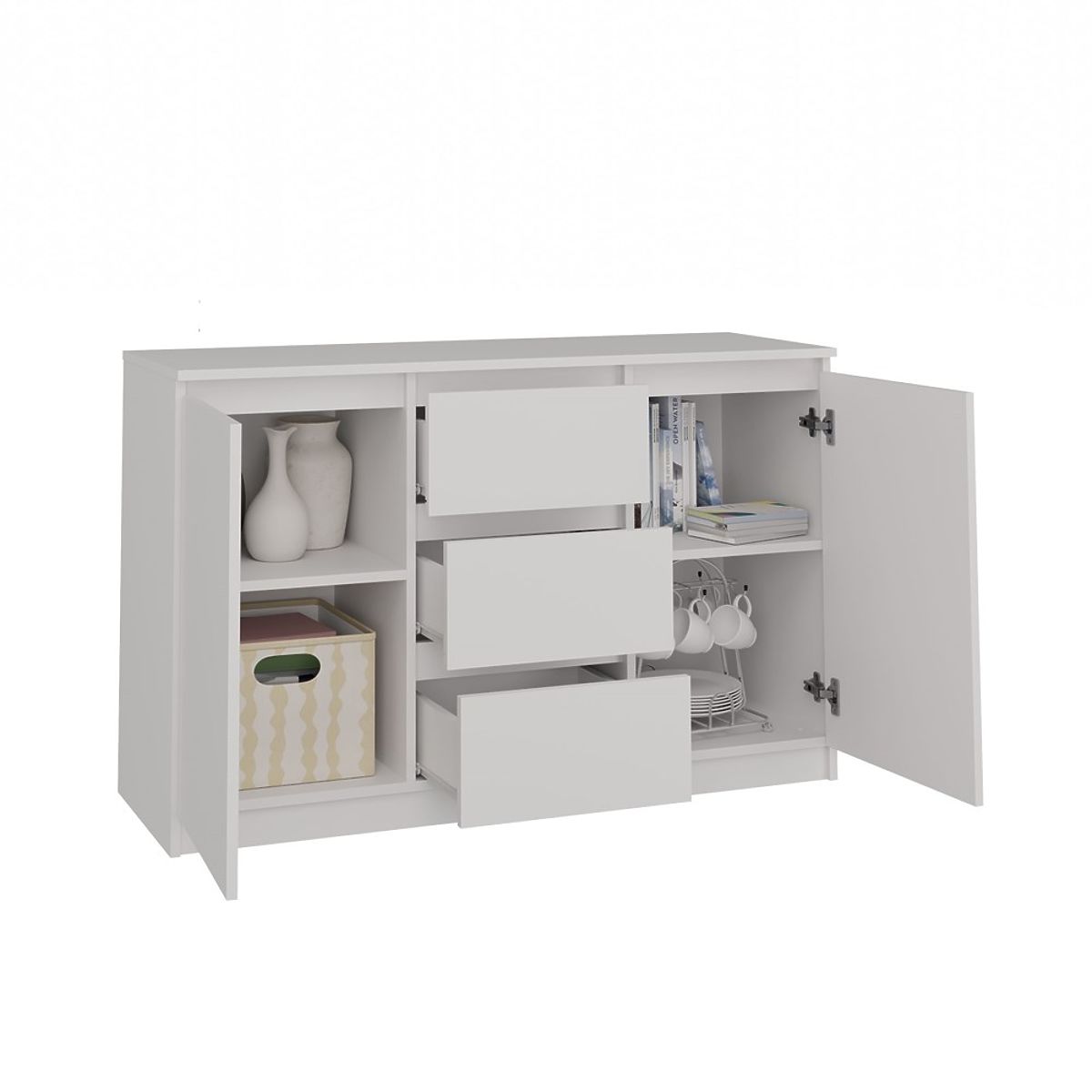 A komód belseje polcokból és három fiókból áll, amelyek segítenek a dolgok elrendezésében. Könnyebb megtalálni, amit keres.