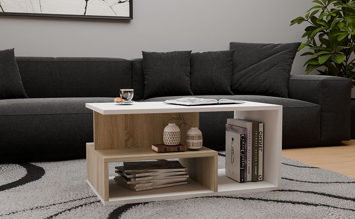 Laminált lapból készült kávéasztal, kiegészítő polccal. .. többet