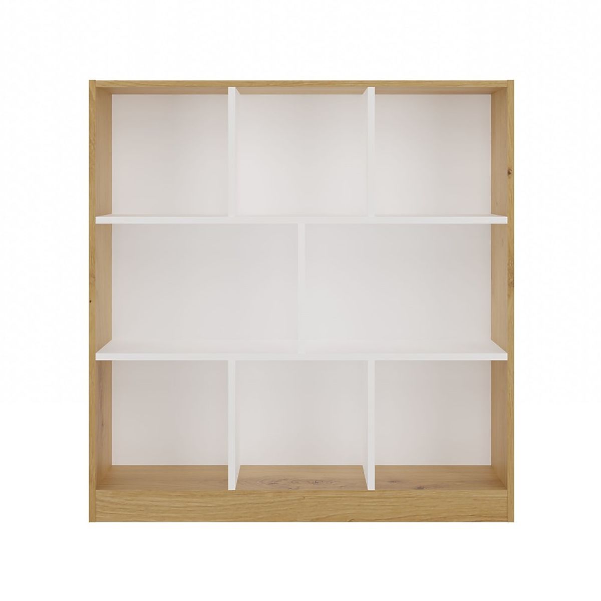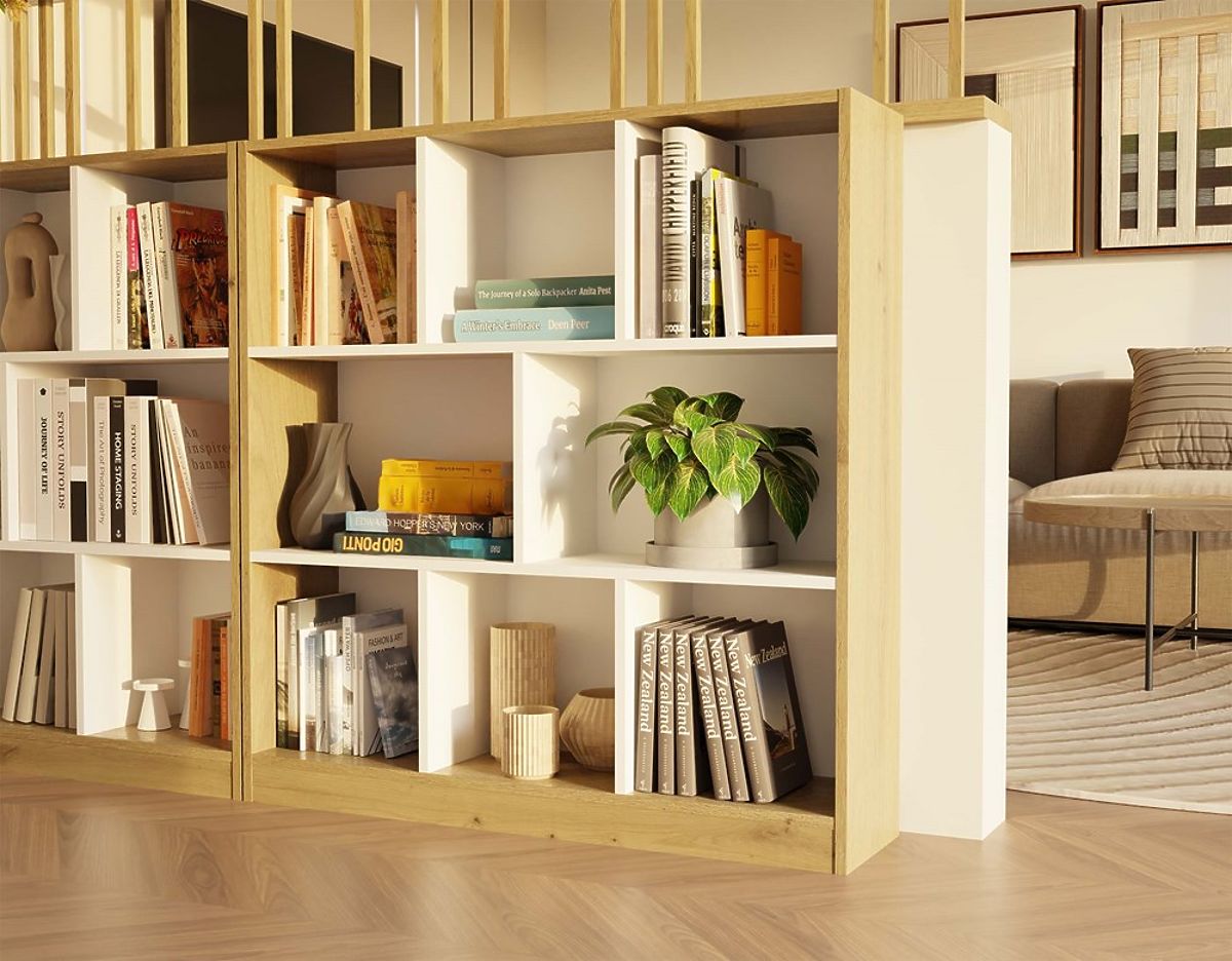 8 tágas rekesszel rendelkezik, amelyek segítenek a tér szervezésében és lehetővé teszik kedvenc tárgyaink esztétikus bemutatását. Az artisan tölgy meleg árnyalatának és a kontrasztos fehér polcoknak a kombinációja modern és elegáns karaktert kölcsönöz a bútornak.