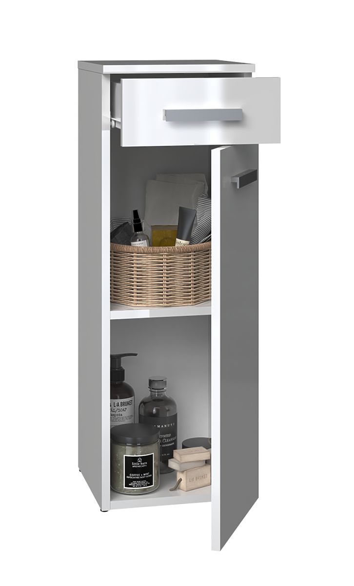 Fehér fényes fürdőszobai szekrény fiókkal és ajtóval. .. többet