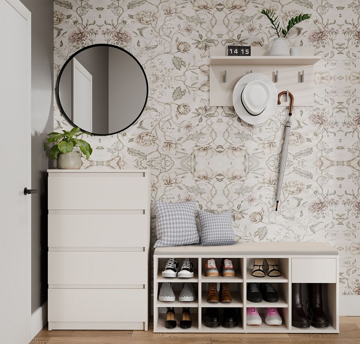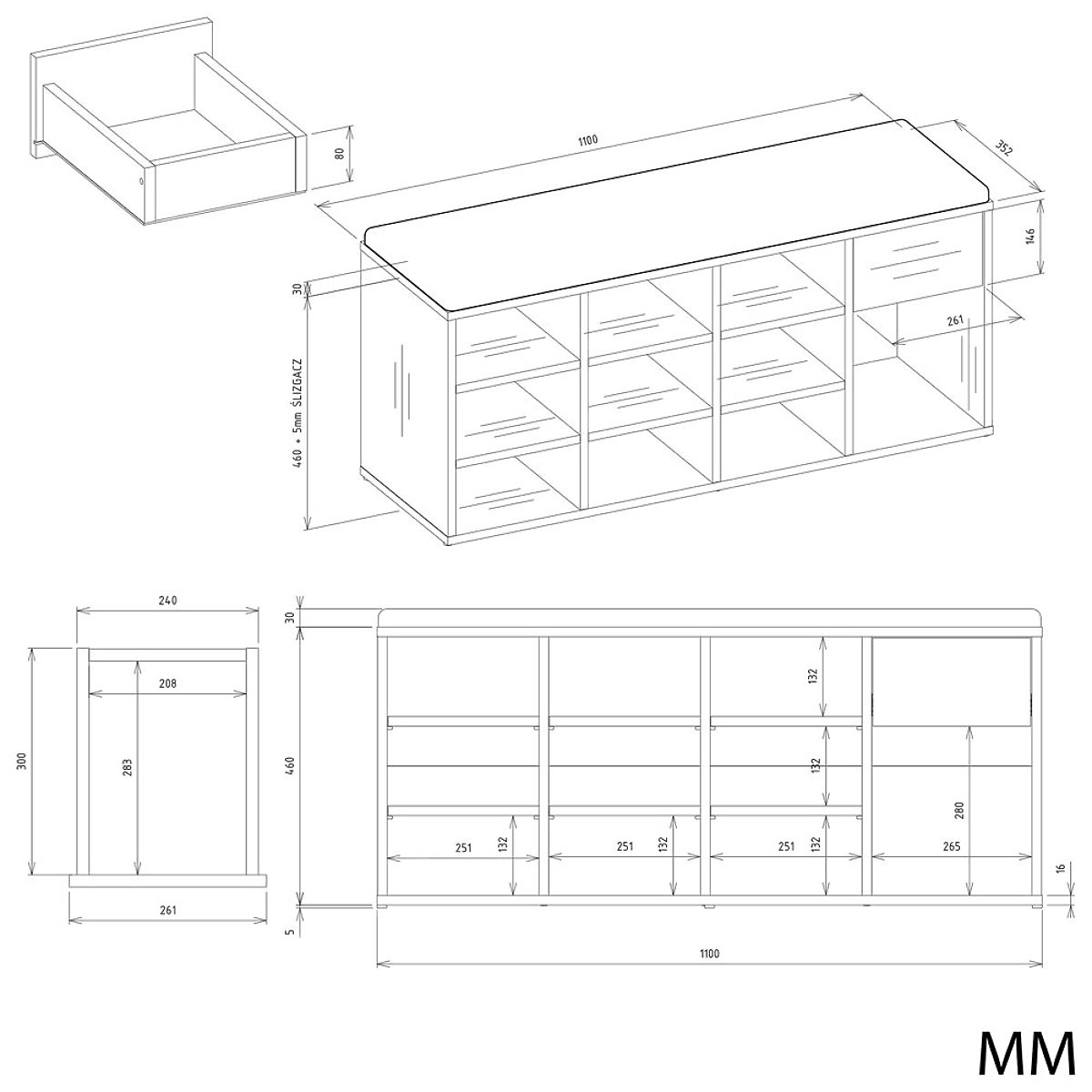 Nyitott cipősszekrény ülőhellyel és tárolóval. .. többet