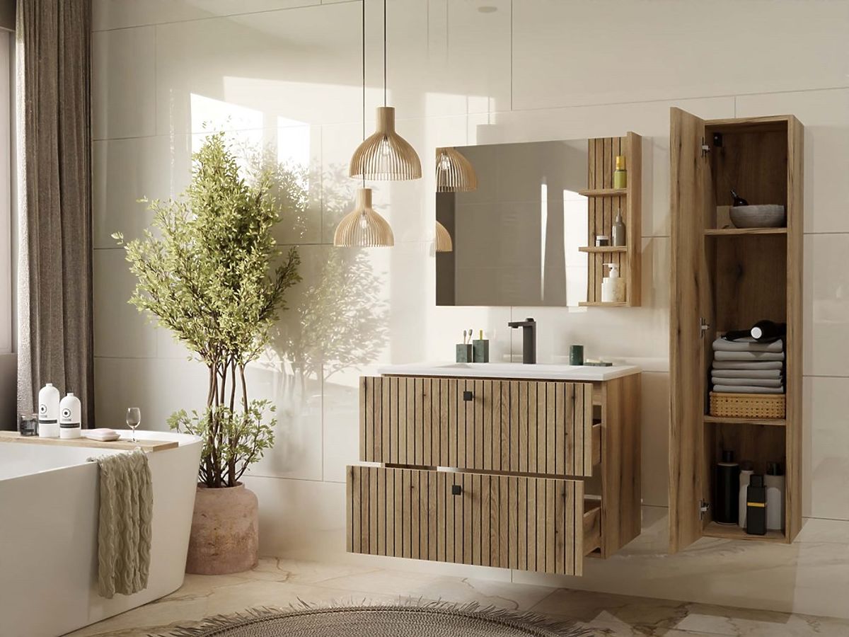 Lukahome.hu » Fürdőszoba és WC / Fürdőszobák szekrények / FÜRDŐSZOBASZEKRÉNY MOSDÓ ALÁ TIGO 80 2S TÖLGY EVOKE 2 FIÓK ROVÁSMINTÁS ELŐLAP FÜGGESZTETT