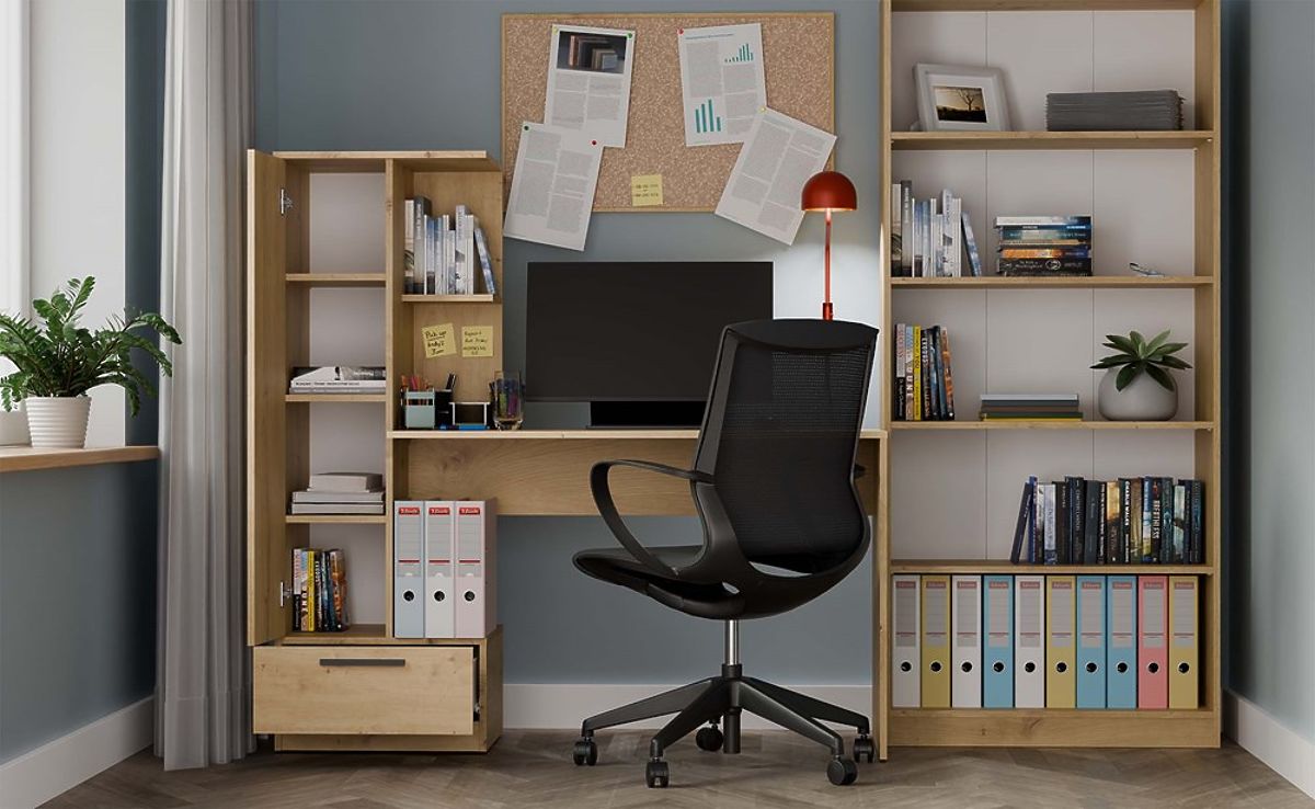 Az integrált polc ajtóval zárható részt tartalmaz, ahol három tágas polc található, valamint egy fiókot és nyitott polcokat, így könnyedén rendszerezheti az összes szükséges dolgot – a könyvektől és dokumentumoktól kezdve az apróságokig.