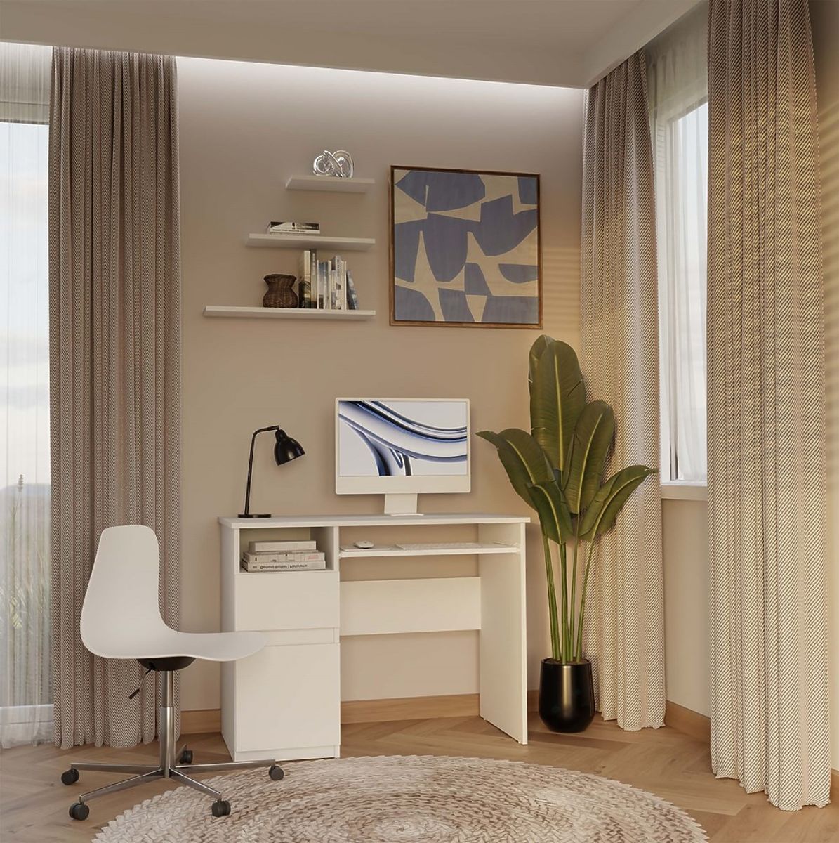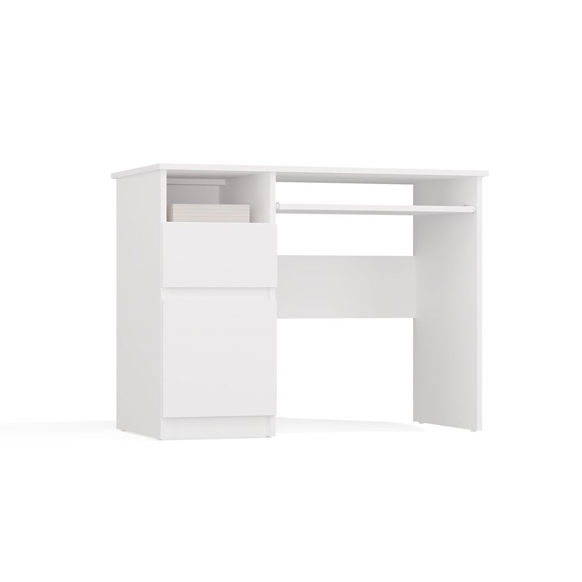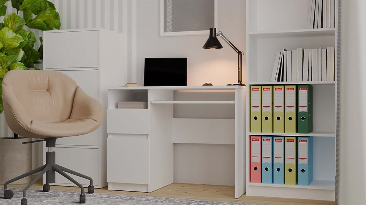 Fehér íróasztal fiókkal és billentyűzettartóval. .. többet