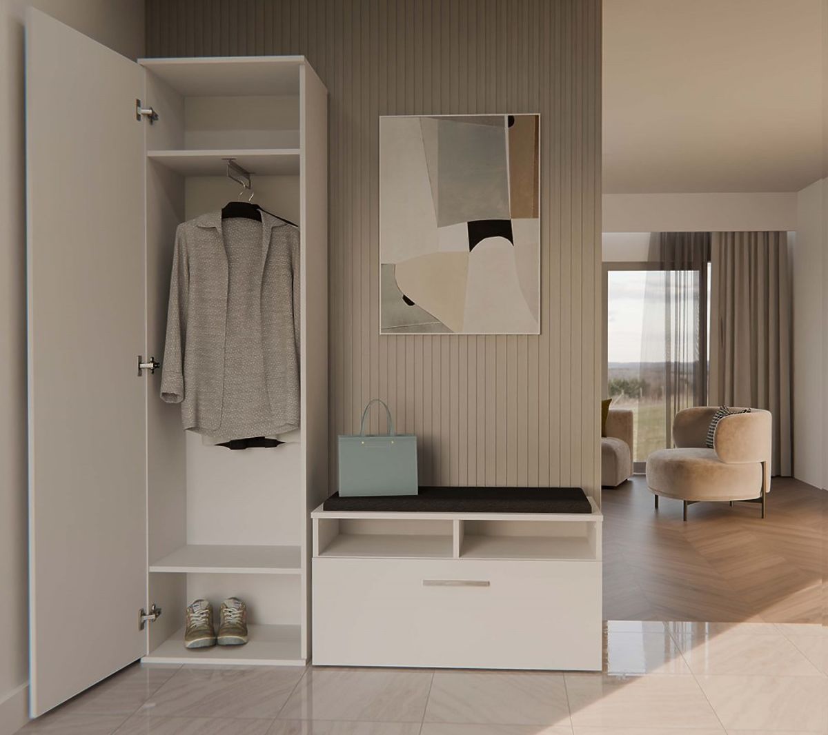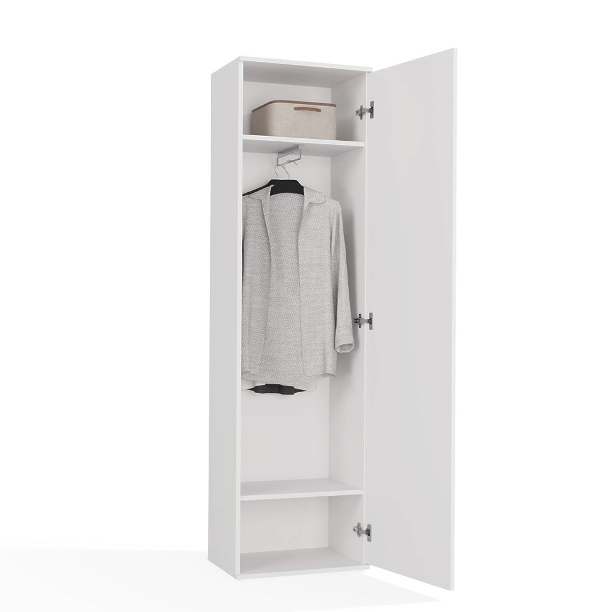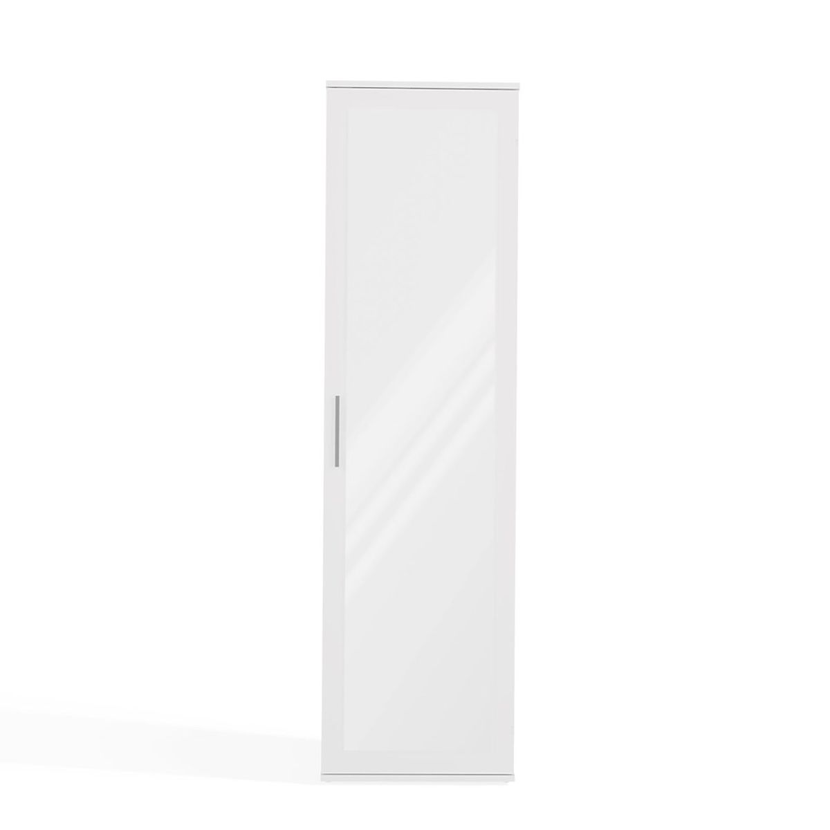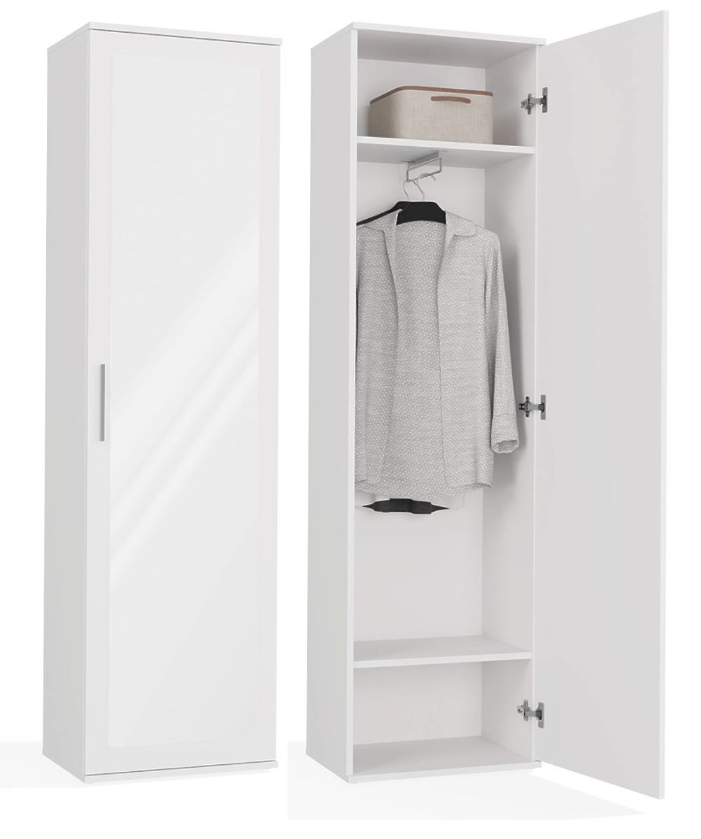 Tükrös, fehér szekrény modern dizájnnal és praktikus tárolási lehetőségekkel. .. többet