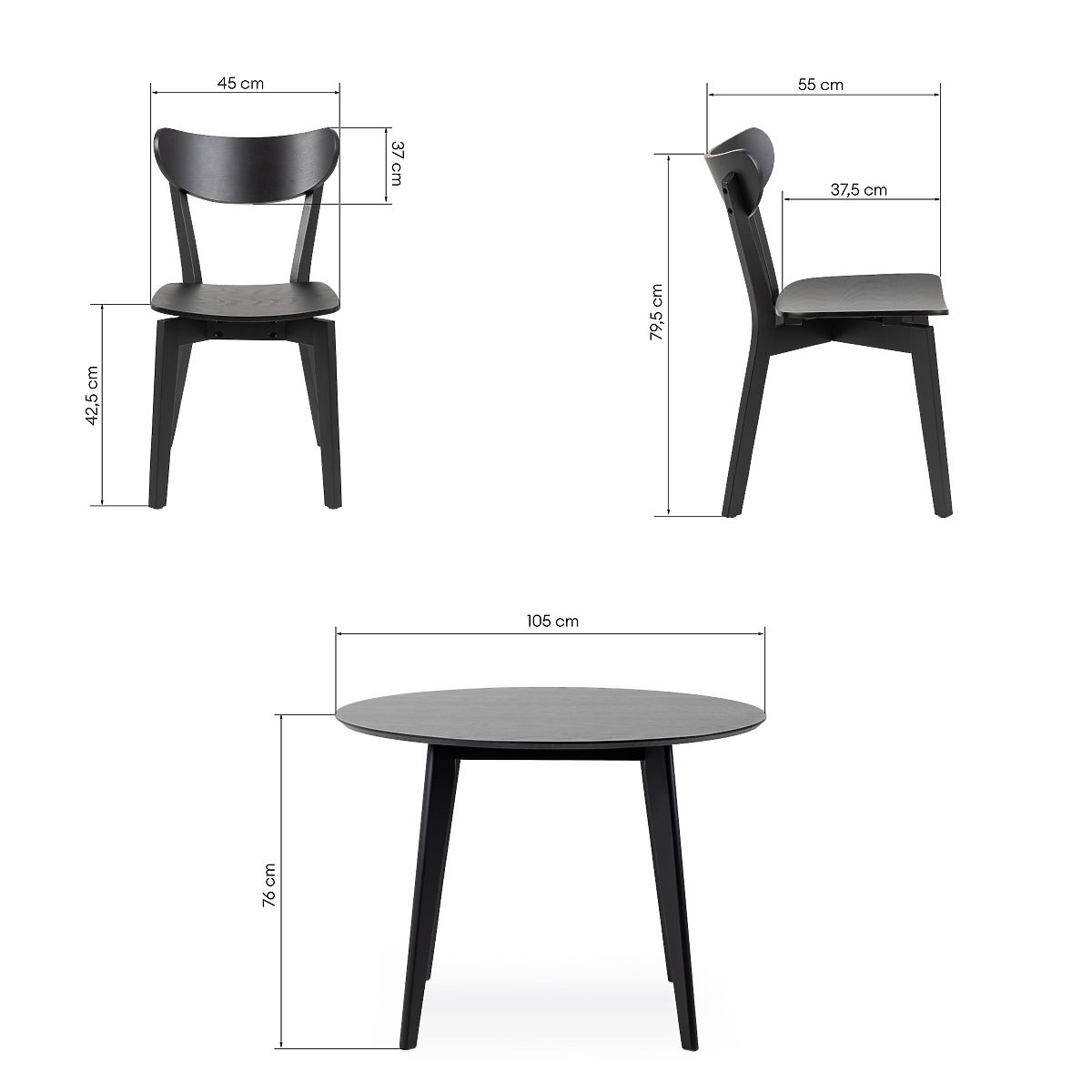 Kerek asztal és négy fekete szék időtlen dizájnnal. .. többet