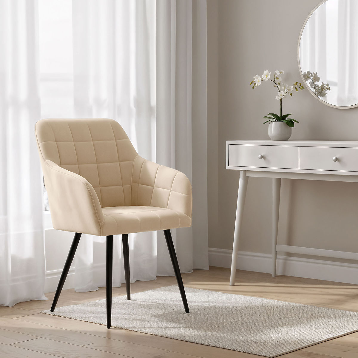 Kárpitozott étkezőszék bézs színben, fekete lábakkal. .. többet