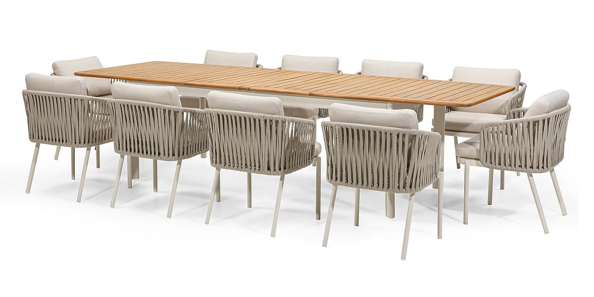 Tizenkét kényelmes, kötélfonatos és puha párnákkal ellátott szék magas komfortot nyújt hosszú ülések során is. A vízlepergető huzatok levehetők és könnyen tisztíthatók. A minőségi anyagok használatának köszönhetően a szett ellenáll az időjárás viszontagságainak, és hosszú távú kültéri használatra is alkalmas.