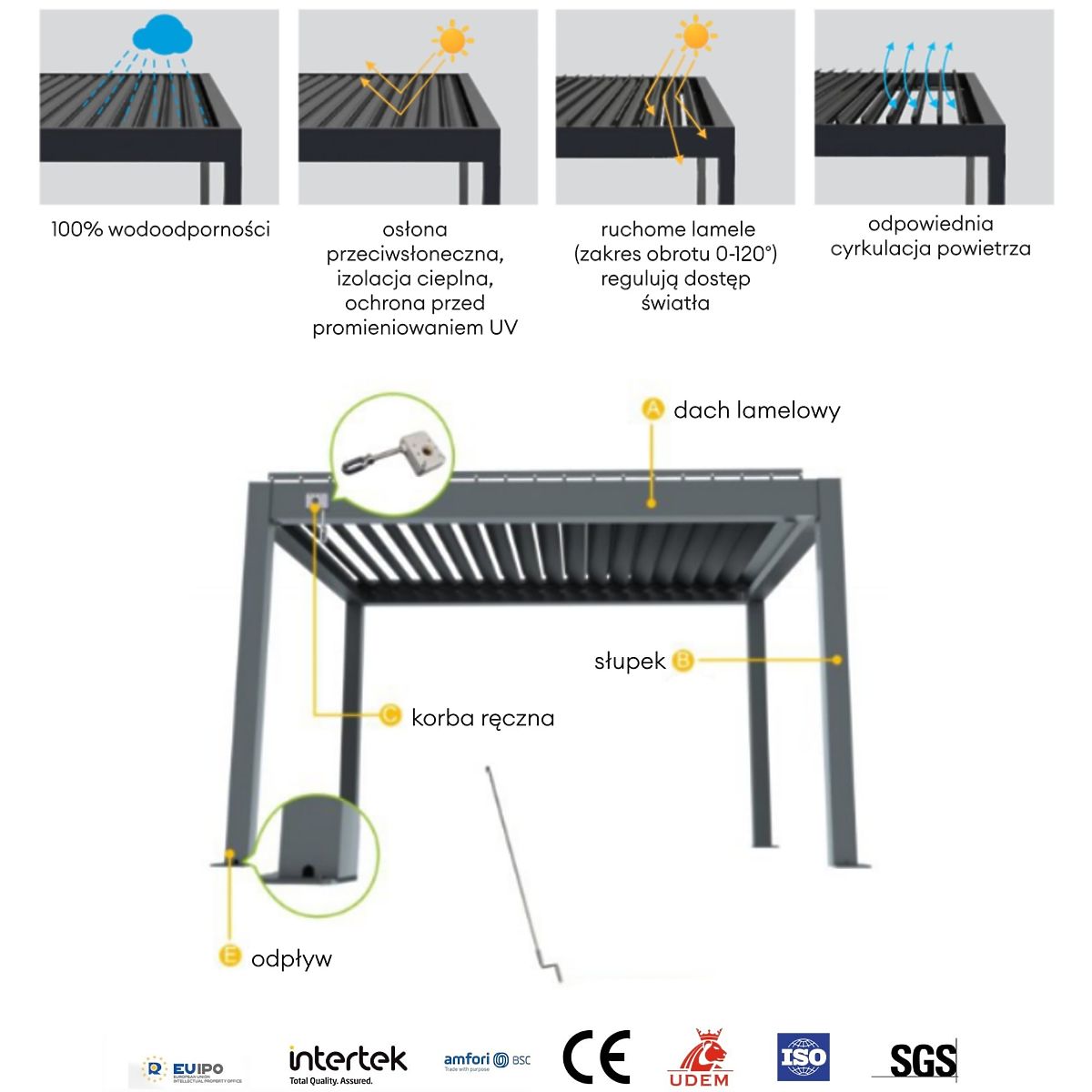- Karral vezérelt mozgatható lamellák (forgási tartomány 0-120°) szabályozzák a fény bejutását és 100%-os vízállóságot biztosítanak zárásuk után