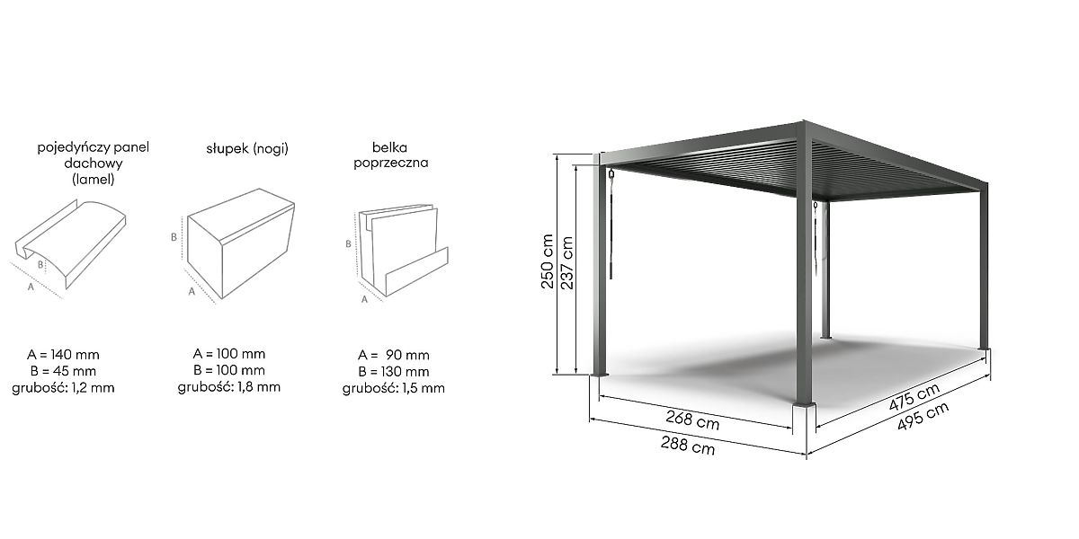 Fedezze fel a pihenés és a friss levegőn való időtöltés korlátlan lehetőségeit az Antilla kerti pergolával! Ez a szabadon álló, masszív alumíniumból készült szerkezet nemcsak eleganciát és funkcionalitást kölcsönöz kertjének, hanem teret is teremt a pihenéshez és felejthetetlen pillanatokhoz szeretteivel. Impozáns mérete - 5x3 m - sokkal nagyobb funkcionalitást és rugalmasságot kínál a kisebb modellekhez képest. A nagy tér lehetővé teszi különböző részek, például étkező- és pihenőzóna kialakítását, valamint kényelmes relaxációs zóna létrehozását innovatív megoldásokkal, mint például audiorendszerek vagy vetítővásznak filmnézéshez. A nagyobb méreteknek köszönhetően a pergola a kert vagy terasz központjává válik, kényelmesen elférnek alatta pihenőgarnitúrák és kerti bútorok. Az ilyen megoldás nagyobb kényelmet biztosít társasági összejövetelek során, valamint jobb elválasztást a környezettől, növelve a magánélet érzését. Ezenkívül a 3x5 m-es pergola autóbeállóként is használható, védve a járművet az esőtől, hótól és káros UV-sugárzástól. Az erő és elegancia kéz a kézben jár - az Antilla pergola alumínium szerkezete nemcsak modern dizájnnal bűvöl el, hanem kivételes tartóssággal is. Ellenáll a korróziónak, és akár 120 km/h sebességű szélnek és 60 kg/m² hóterhelésnek is ellenáll. Tetője mozgatható lamellákból áll, amelyek dőlésszöge az időjárási körülményekhez igazítható két kényelmes kar segítségével. A panelek nemcsak a fény bejutását szabályozzák, hanem 100%-os vízállóságot is garantálnak zárásuk után, hatékonyan védve az esőtől és a túlzott napsugárzástól. Pergoláink lamellái 100%-ban alumíniumból készültek - könnyűek, korrózióállóak és rendkívül tartósak. Az acél megoldásokkal ellentétben nem rozsdásodnak és nem terhelik a szerkezetet. Ezenkívül ideális légáramlást biztosítanak, kényelmes légkört teremtve használat közben. A pergola átgondolt szerkezete hatékony esővíz-elvezetést tesz lehetővé, és a rendszer minden eleme diszkréten rejtve van a négy láb mindegyikében, így az egész esztétikus megjelenést kölcsönöz. Az Antilla bioklimatikus pergola rendelkezik a szükséges tanúsítványokkal és igazolásokkal, amelyek igazolják a legmagasabb szabványok teljesítését, így kiválóan alkalmas mind magánteraszokra és kertekbe, mind kereskedelmi terekbe, mint például éttermek és szállodai kertek. A pergola önálló összeszerelésre készült - a készletben mindent megtalál, ami szükséges saját pihenőoázisának létrehozásához, és a lépésről-lépésre útmutató egyszerűvé és kielégítővé teszi az összeszerelési folyamatot. Hogy pihenése még kellemesebb legyen, pergoláját kiegészítő, fizetős tartozékokkal is felszerelheti. A könnyen tisztítható, fehér színű szövetfüggöny nemcsak további védelmet nyújt a nap ellen, hanem átlátszóságot is biztosít, könnyedség és szabadság légkörét teremtve. Ha pedig átfogó védelemre vágyik, válassza a screen típusú rolót. Időjárásálló szövetből készült, véd az UV-sugárzástól, enyhe széltől és esőtől, valamint a rovaroktól, miközben kellemes árnyékolást biztosít. Eldöntheti, hogy a pergola hány falára és hogyan szeretné felszerelni a függönyöket vagy rolókat. Ehhez a konfigurátorban ki kell választania azok mennyiségét és a fal szélességéhez igazított méretet (475 és 268 cm). De ez még nem minden! Hogy belemerüljön az esti varázslatos hangulatba, válassza a hangulatvilágítást LED-del. Választhat a hagyományos, távirányítóval és vezérlődobozzal ellátott vagy az energiatakarékos napelemes világítás között, amely napelem és beépített akkumulátor segítségével működik.