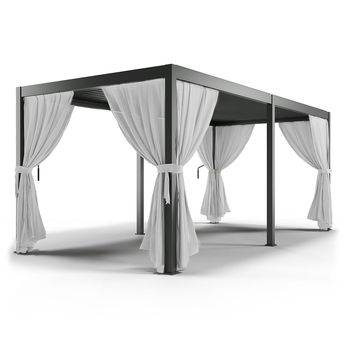 Az Antilla pergola függönykészlete ideális megoldás a kényelem és elegancia érdekében a kertjében. Könnyen tisztítható és tartós poliészter anyagból, terylenből készültek, nemcsak eleganciát kölcsönöznek, hanem könnyedség és szabadság érzetét is megteremtik. A függönyök védelmet nyújtanak a káros UV-sugárzás, enyhe eső és szél ellen, miközben kellemes árnyékolást és magánszférát biztosítanak. A függönykészlet egy 586 cm széles pergola falára történő felszerelésre készült. A függönyöket a pergola gerendájához csavarokkal rögzített sínre szerelik fel.