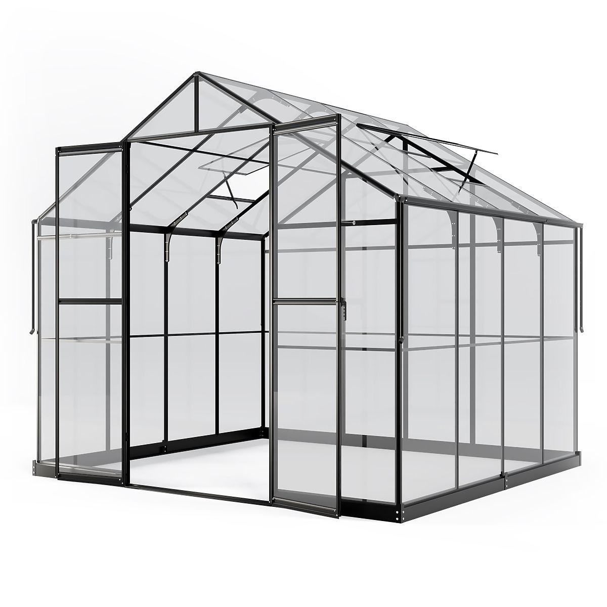 Az üvegház szilárd, 1-1,8 mm vastag alumínium szerkezettel rendelkezik, amelyet rozsdamentes csavarok erősítenek meg. A további stabilitást egy 12 cm magas fém alap biztosítja. Két billenő ablak és egy zárható kétszárnyú ajtó megfelelő szellőzést biztosít, ami kulcsfontosságú a növények egészséges növekedéséhez és a kényelmes tartózkodáshoz az üvegházban. Az alacsony küszöb a bejáratnál megkönnyíti a belépést és a berendezések, például fűnyíró vagy talicska bevitelét.