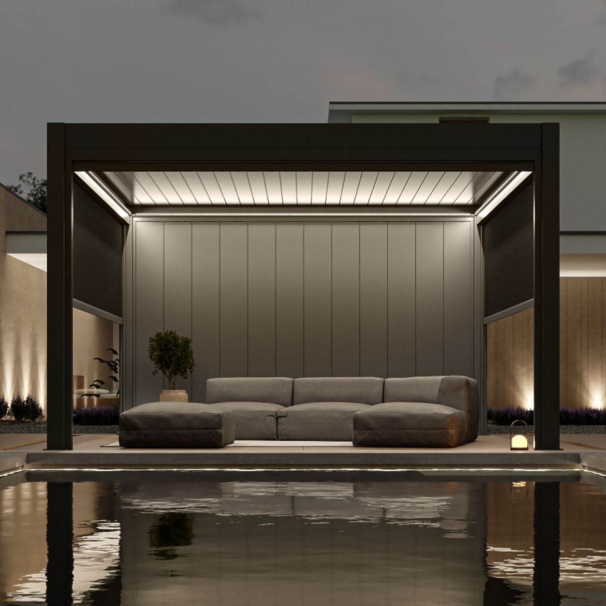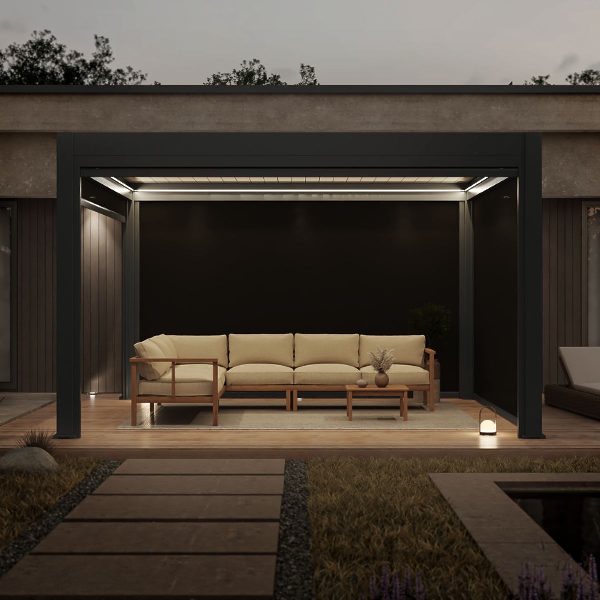 A Lumera több mint egy pergola – egy stílusosan tervezett tér, amely növeli a kert használatának kényelmét, és minden kinti pillanatot különlegessé tesz. A még nagyobb kényelem érdekében lehetőséget kínálunk a szerkezet bővítésére kézi zsalu panellel vagy könnyen tisztítható szövetből készült, antracit árnyalatú screen rolóval.