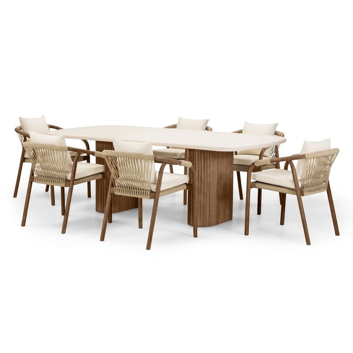 A garnitúra része hat stílusos szék, amelyek lekerekített akácfa váza stabilitást és tartósságot biztosít. A fonott háttámlák és ülőfelületek, amelyek tartós kötélből készültek, nemcsak vonzzák a tekintetet, hanem kiváló légáramlást is biztosítanak. Az egészet kényelmes párnák egészítik ki, amelyek a friss levegőn való pihenésre hívogatnak. Az alkalmazott szövet hidrofób tulajdonságokkal rendelkezik, de a tartósság megőrzése érdekében javasoljuk, hogy eső esetén védett helyen tárolja.