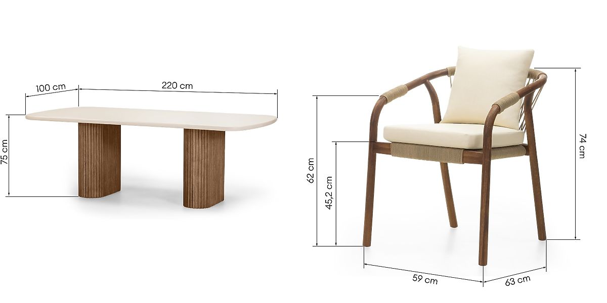 A garnitúra központi eleme az asztal világos bézs színű lapja, amely innovatív Superstone anyagból készült – egy kompozit, amely tökéletesen utánozza a természetes követ, de sokkal ellenállóbb az időjárás viszontagságaival és az UV sugárzással szemben. Finoman lekerekített élei könnyedséget kölcsönöznek, míg az akácfából készült masszív lamellás lábak kiemelik az eleganciát és meleg, természetes karaktert adnak.