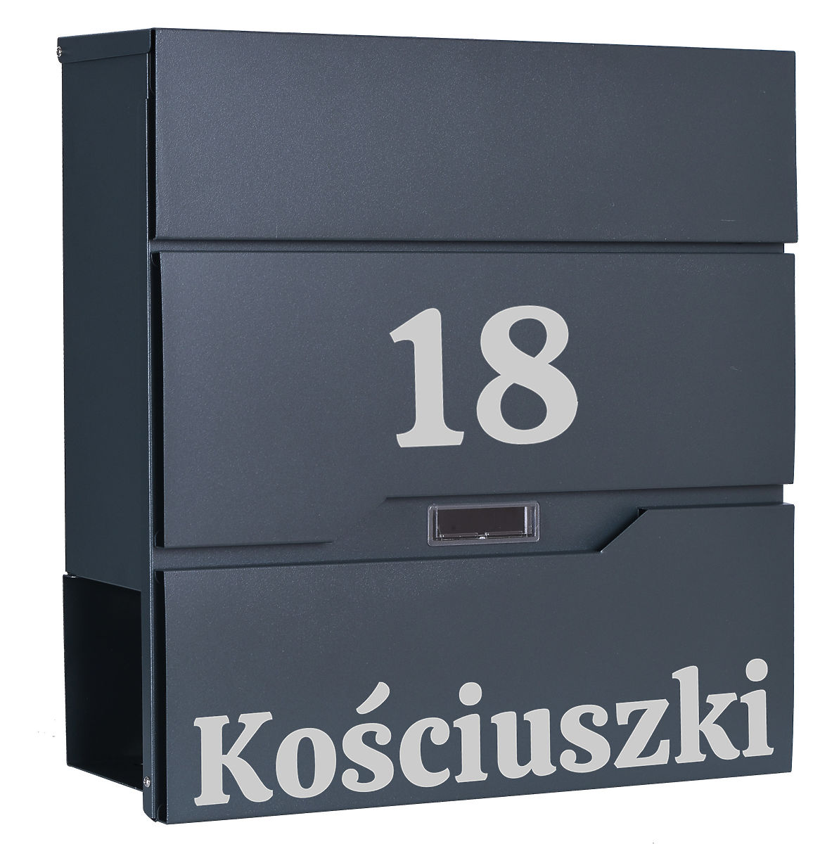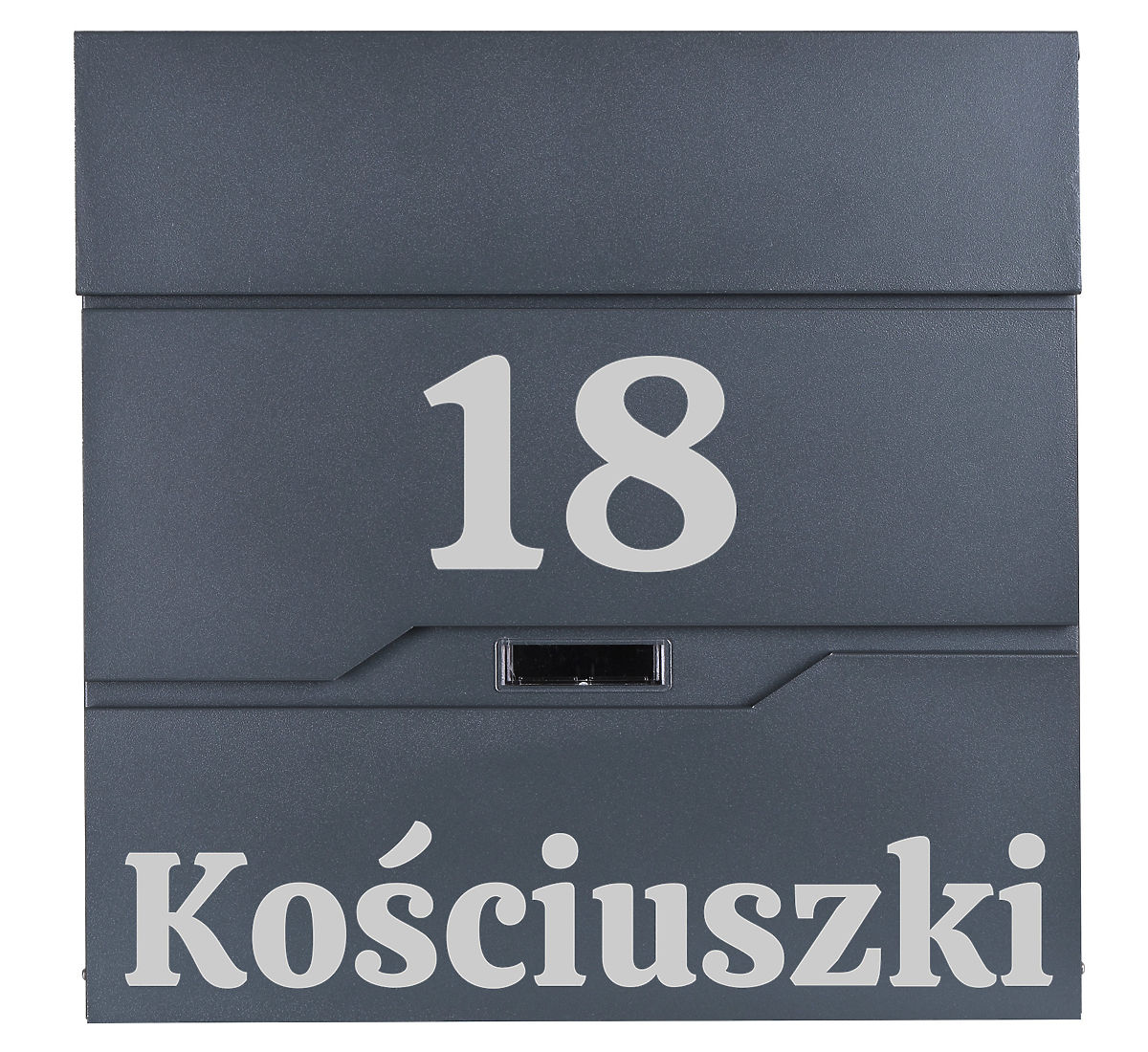 Lehetőség bármilyen felirat létrehozására: házszám, cég neve, vezetéknév, utca stb. A felirat Oracal fóliával készül, amely időjárásálló. A fólia ezüst színű.