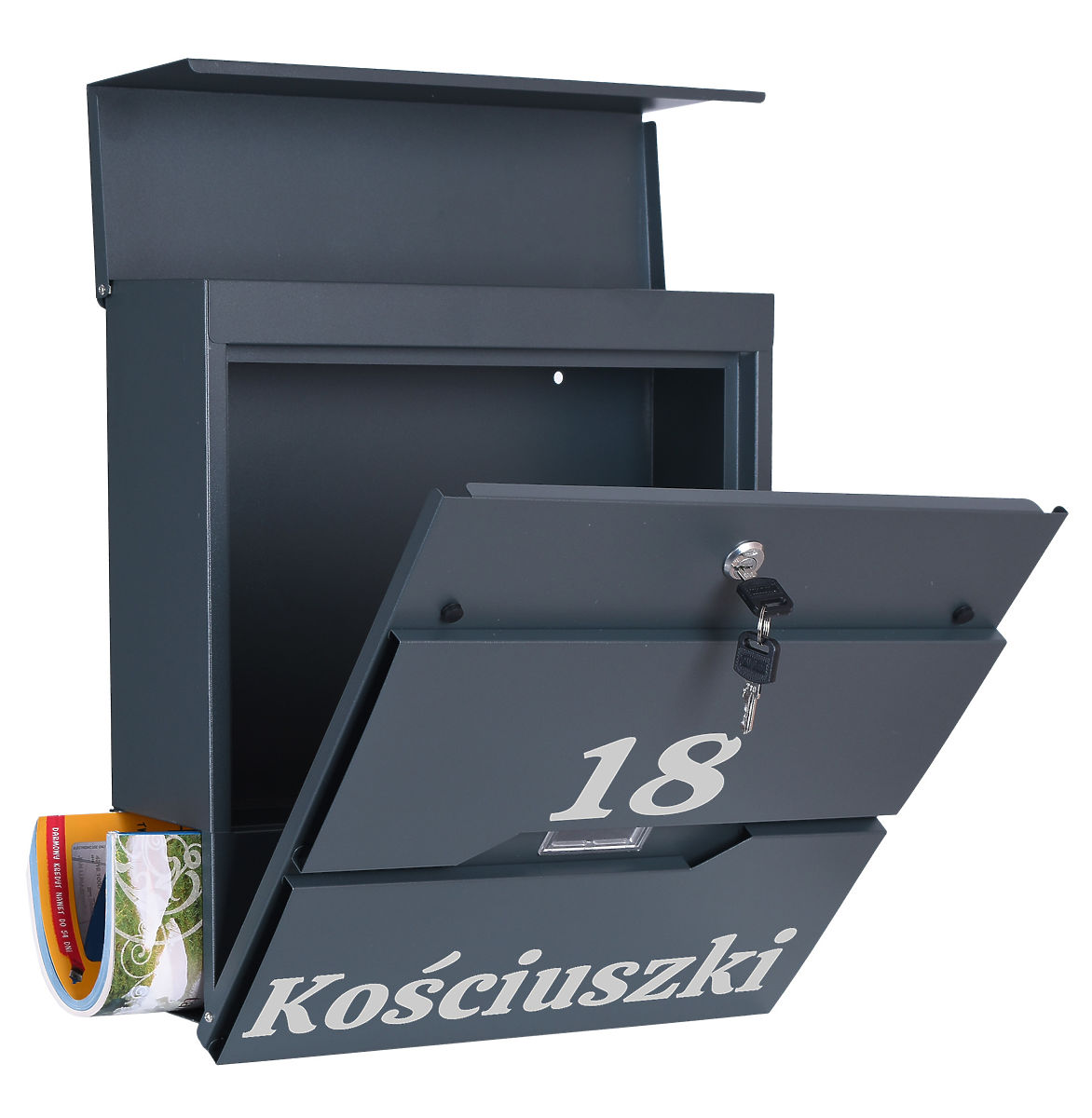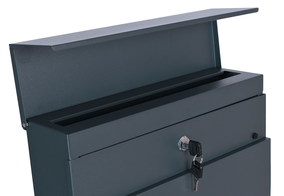 Stílusos és funkcionális levélszekrény, amely ötvözi a modern dizájnt a tartóssággal! Méretei 37 x 37 x 11 cm, erős horganyzott acél porbevonattal és időjárásállósággal biztosítja, hogy ideális legyen kültéri és beltéri használatra egyaránt. A praktikus címablak lehetővé teszi a várakozó levelek azonnali megtekintését. Levélnyílás 33 x 3,5 cm, további hely újságoknak és kulccsal zárható – a Vidar szekrény biztonságot és kényelmet nyújt!