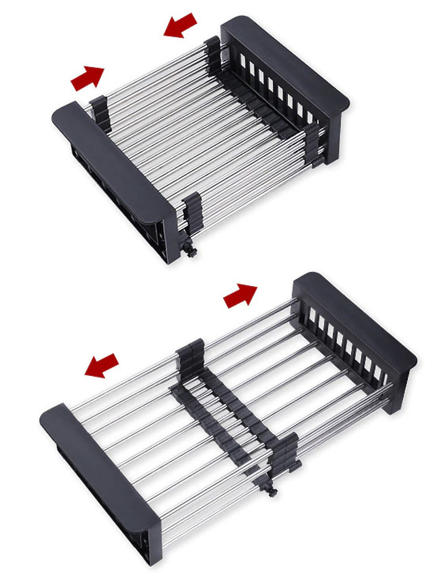 Praktikus és univerzális csepegtető zöldségek és gyümölcsök számára. Erős műanyagból és rozsdamentes acélból készült. Korrózióálló és nagyon tartós. A teleszkópos kialakítás lehetővé teszi a mosogató kívánt méretéhez való igazítást. A kosár 28 cm-től 43 cm-ig állítható.
