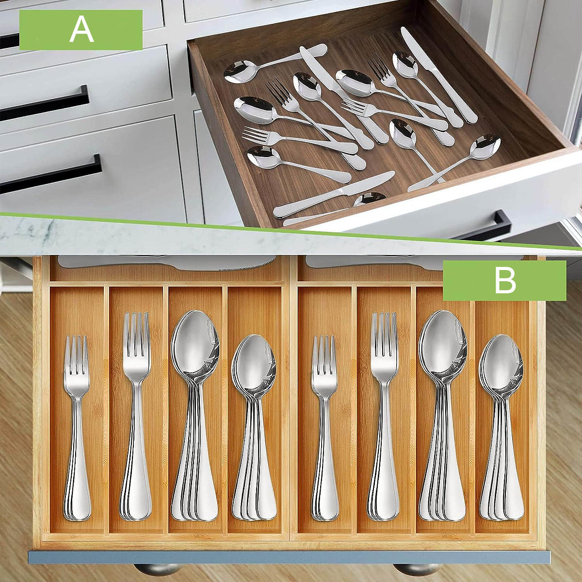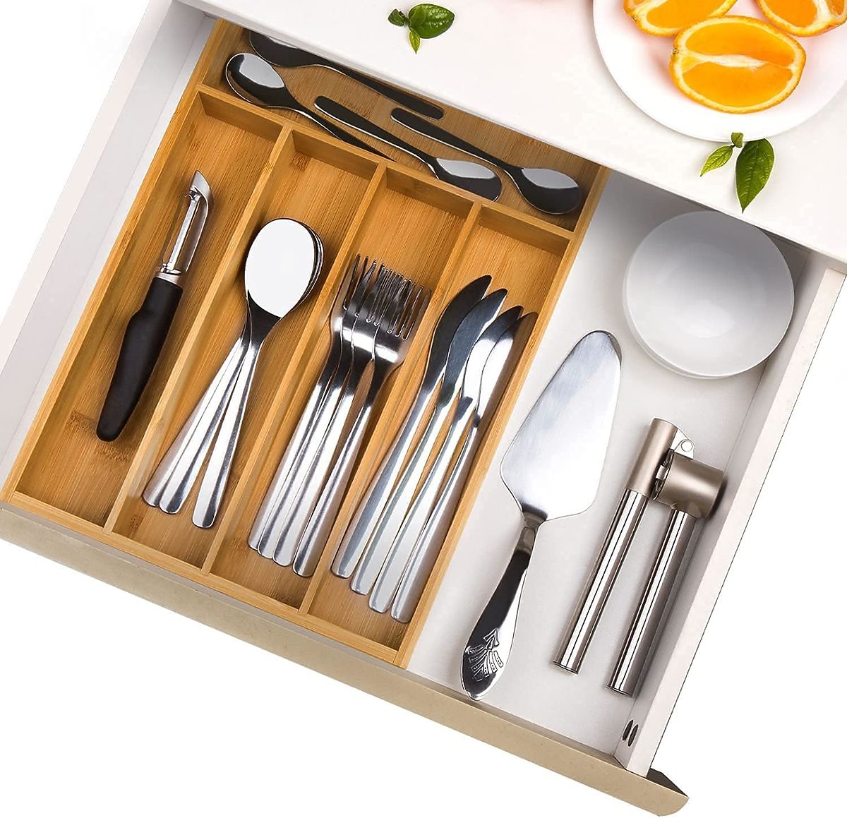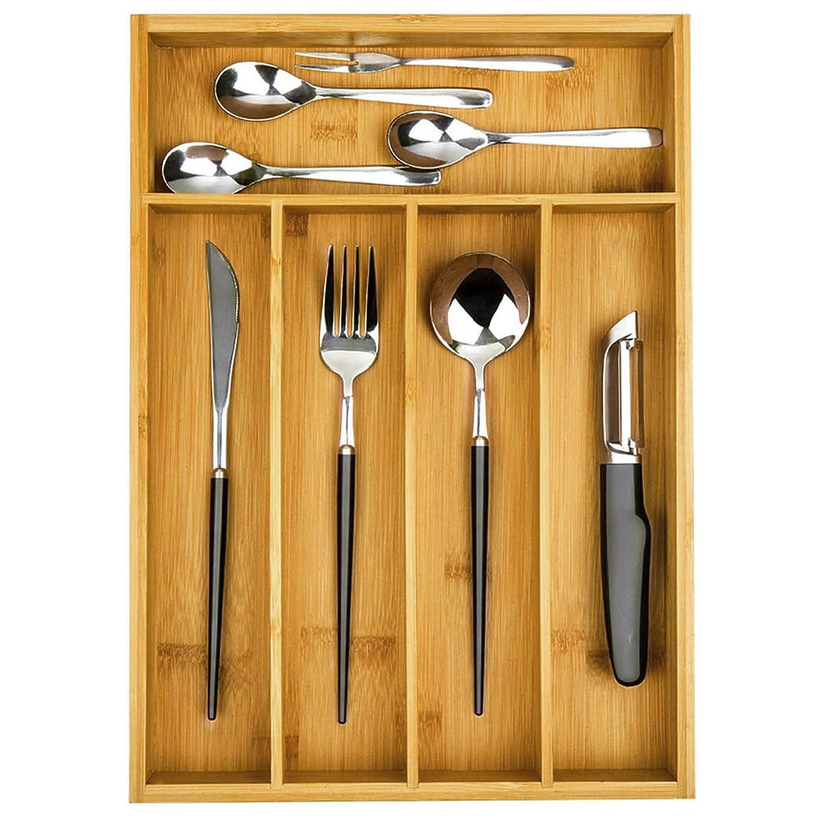 Méretei: 25 x 35 cm biztosítják, hogy a legtöbb fiókba beleférjen, 5 rekeszt kínálva evőeszközök és más tárgyak számára. Nemcsak evőeszközök tárolására szolgál, hanem sokoldalú rendező kiegészítők vagy kozmetikumok tárolására a konyhában, irodában vagy fürdőszobában.