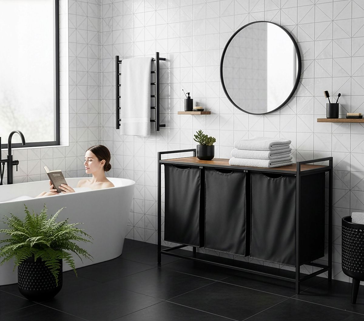 Az Artus háromrekeszes szennyestartó kiváló megoldás azok számára, akik értékelik a rendet és a funkcionalitást a fürdőszobai térben. Loft, ipari dizájnja remekül illik a modern belső terekhez, maximális kényelmet és helytakarékosságot kínálva. A három különálló rekesz lehetővé teszi a pontos szennyesszeparálást, megkönnyítve a mindennapi teendők szervezését. Ezenkívül a kosarak feletti praktikus polc ideális hely a törölközők és fürdőszobai kiegészítők számára. Az Artus kosárral nemcsak a fürdőszobája esztétikáját gazdagítja, hanem annak funkcionalitását is növeli.