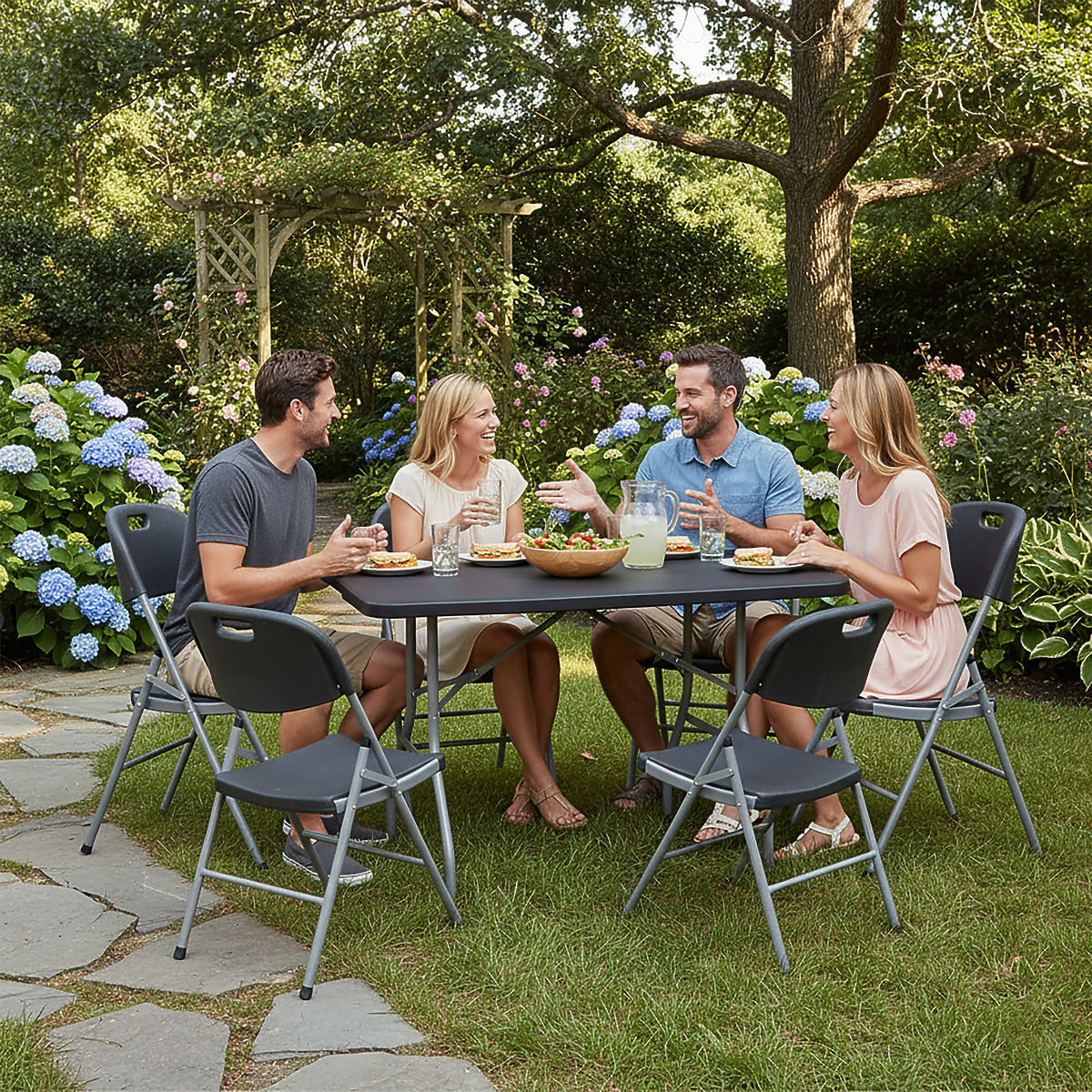 Ez a catering készlet, amely egy 180 cm hosszú összecsukható asztalt és 6 összecsukható széket tartalmaz, ideális különféle eseményekhez. Az acél porfestett szerkezet biztosítja a szilárdságot, míg a HDPE anyagból készült asztallap és ülések ellenállnak a sérüléseknek. Az asztal és a székek könnyen szállíthatók – az asztal praktikus fogantyúval, a székek pedig a háttámlán lévő nyílással rendelkeznek, ami megkönnyíti a szállítást. Az egész készlet időjárásálló, és a lábakon található csúszásmentes talpak biztosítják a stabilitást.