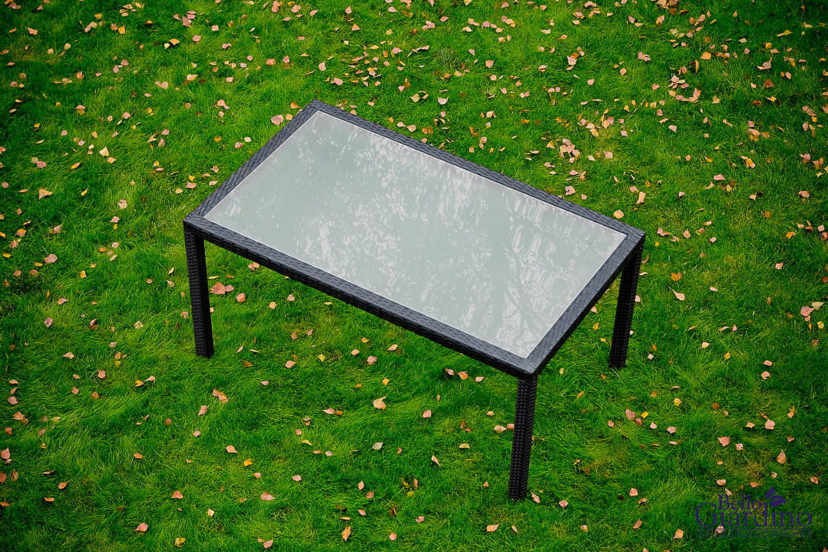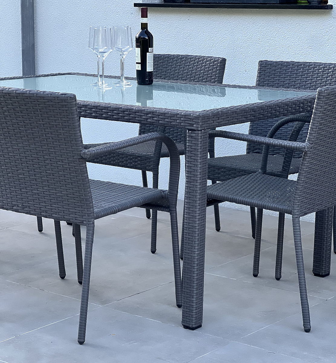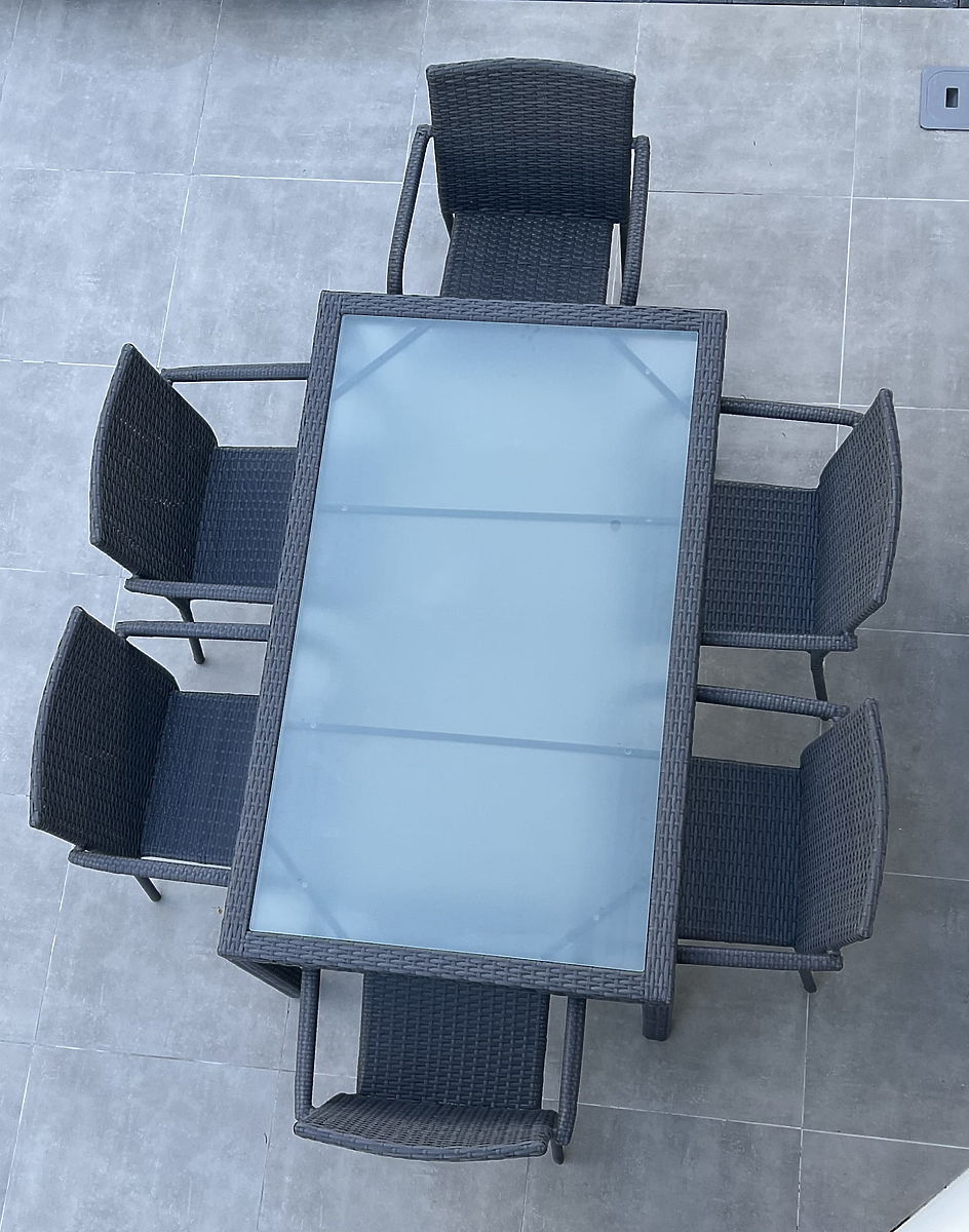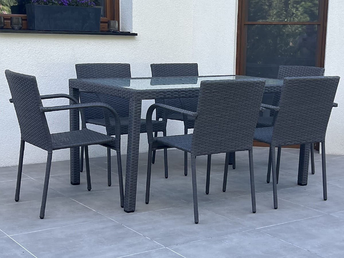 Bútor szerkezete: asztal – alumínium, székek – acél A szett 7 részből áll: 1 × asztal (5 mm-es biztonsági üveglappal): hossz 150 cm, szélesség 90 cm, magasság 74 cm6 × szék: szélesség 56 cm, mélység 50 cm, magasság 84 cm, ülésmagasság a talajtól 44 cm, háttámla magassága az üléstől 43 cm, ülés szélessége 40 cm, ülés mélysége 43 cmA szett 1 raklapon kerül szállításra, méretei 120 × 80 × 170 cm, súlya 60 kg. A székekhez párnák külön megvásárolhatók itt. A székek azonnal használhatók kicsomagolás után. A székek egymásba rakhatók, ami jelentősen megkönnyíti a tárolást és helyet takarít meg. Az asztal egyszerű önálló összeszerelésre készült a mellékelt útmutató alapján. A matt üvegasztal technorattan keretbe van helyezve. A technorattan ellenáll a káros időjárási hatásoknak, azonban a megjelenés hosszabb megőrzése érdekében javasoljuk védőburkolat vásárlását. A sötétszürke burkolat egyszemélyes, és alsó zsinórral rendelkezik a szoros rögzítéshez. Minden burkolat egyedi megrendelésre készül, a megvalósítási idő körülbelül 14 munkanap.