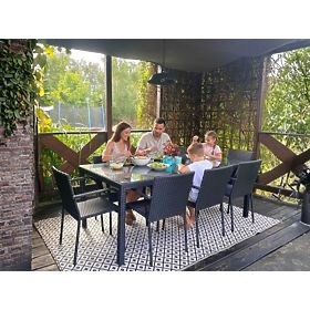 A SOTTILE kerti bútor ideális megoldás azok számára, akik értékelik a kerti bútorok eleganciáját, kényelmét és tartósságát. Az 8 személyes étkezőgarnitúra kiváló feltételeket biztosít a közeli barátokkal való találkozók szervezéséhez, egyesítve a rendkívüli kényelmet az egyedi dizájnnal. A kerti garnitúra minden eleme kiváló minőségű technorattanból készült, ami nemcsak hosszú élettartamot és időjárásállóságot biztosít, hanem könnyű karbantartást is lehetővé tesz. A kiváló kidolgozás kiemeli a bútor luxus jellegét, így a SOTTILE technorattan bútor minden kültéri tér csodálatos díszévé válik. Az asztal és a székek eső- és UV-állóak, ami garantálja, hogy megőrzik esztétikai megjelenésüket hosszú éveken át, elengedhetetlen elemmé válva minden kert, terasz vagy patio berendezésében. A SOTTILE garnitúra színe: fekete – egyszínű, finoman csíkos szerkezet. Fonat: technorattan 7-8mm x 1,2mm. Bútorszerkezet: asztal – alumínium, székek – acél. A garnitúra 9 elemből áll: 1 x asztal: hossz: 200 cm, szélesség: 100 cm, magasság: 74 cm, üveg, átlátszó lap 5 mm biztonsági üvegből, technorattan fonatra helyezve. 8 x szék: szélesség: 56 cm, mélység: 50 cm, magasság: 84 cm, ülésmagasság a padlótól: 44 cm, háttámla magassága az üléstől: 43 cm, ülés szélessége: 40 cm, ülés mélysége: 43 cm. A garnitúra 1 raklapon kerül szállításra, méretei: 120x80x210 cm, súlya 80 kg. A székek a dobozokból kivéve azonnal használhatók. A székek egymásba rakhatók (egymásba helyezhetők), ami megkönnyíti a tárolást, és a bútor nem foglal sok helyet. Az asztal egyszerű, önálló összeszerelésre készült a mellékelt útmutató alapján. Az asztal üveglapja szilikon tapadókorongokkal van rögzítve, amelyek megvédik az elmozdulástól. Párnák vásárlási lehetősége a székekhez itt. A technorattan időjárásálló, de a bútor változatlan megjelenésének hosszabb megőrzése érdekében javasoljuk, hogy vásároljon védőburkolatot. A sötétszürke burkolat egyrészes, és alul húzózsinórral rendelkezik. Minden burkolat egyedi rendelésre készül, és a megvalósítási idő körülbelül 14 munkanap. Képzeljen el egy kerti bútort, amely minden szempontból felülmúlja elvárásait – a tartósságtól a dizájnig. Ez a BELLO GIARDINO, ahol minden részlet számít, és a luxus találkozik a funkcionalitással: Időtálló minőség: A szintetikus rattanunk garantálja, hogy a bútor évekig tartós marad, anélkül, hogy elveszítené szépségét vagy tartósságát. Időjárásállóság: Bútoraink a legkeményebb időjárási körülményekkel is szembenéznek, a perzselő naptól a fagyos telekig, mindig gyönyörűek maradnak. Luxus kényelem: Vastag, puha párnák hívogatnak a pihenésre, olyan kényelmet kínálva, amelyet máshol nehéz megtalálni. Könnyedség és szilárdság: Az alumínium szerkezet a legjobbat ötvözi mindkét világból – könnyű, de rendkívül stabil. Dizájn, amely elbűvöl: Bútoraink minden elemét esztétikai és funkcionális szempontok figyelembevételével terveztük, hogy minden környezetbe illeszkedjenek. Legyen Ön a minimalizmus kedvelője, vagy értékeli a gazdag, elegáns elrendezéseket, bútoraink megfelelnek elvárásainak, túllépve a szokásos funkcionalitás és esztétika határain. Biztosítjuk, hogy még a legellenállóbb vásárlók sem tudnak ellenállni a BELLO GIARDINO által kínált kényelemnek és stílusnak. Tegye kertjét, teraszát vagy erkélyét a relaxáció és elegancia oázisává, amelyet mindig is szeretett volna. Ne várjon, fedezze fel a BELLO GIARDINO-t még ma, és alakítsa át kültéri tereit olyan helyekké, amilyenekről mindig is álmodott. Vásárlóink által készített képek a bútorról: