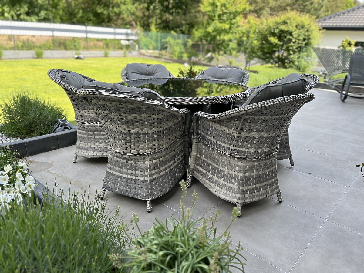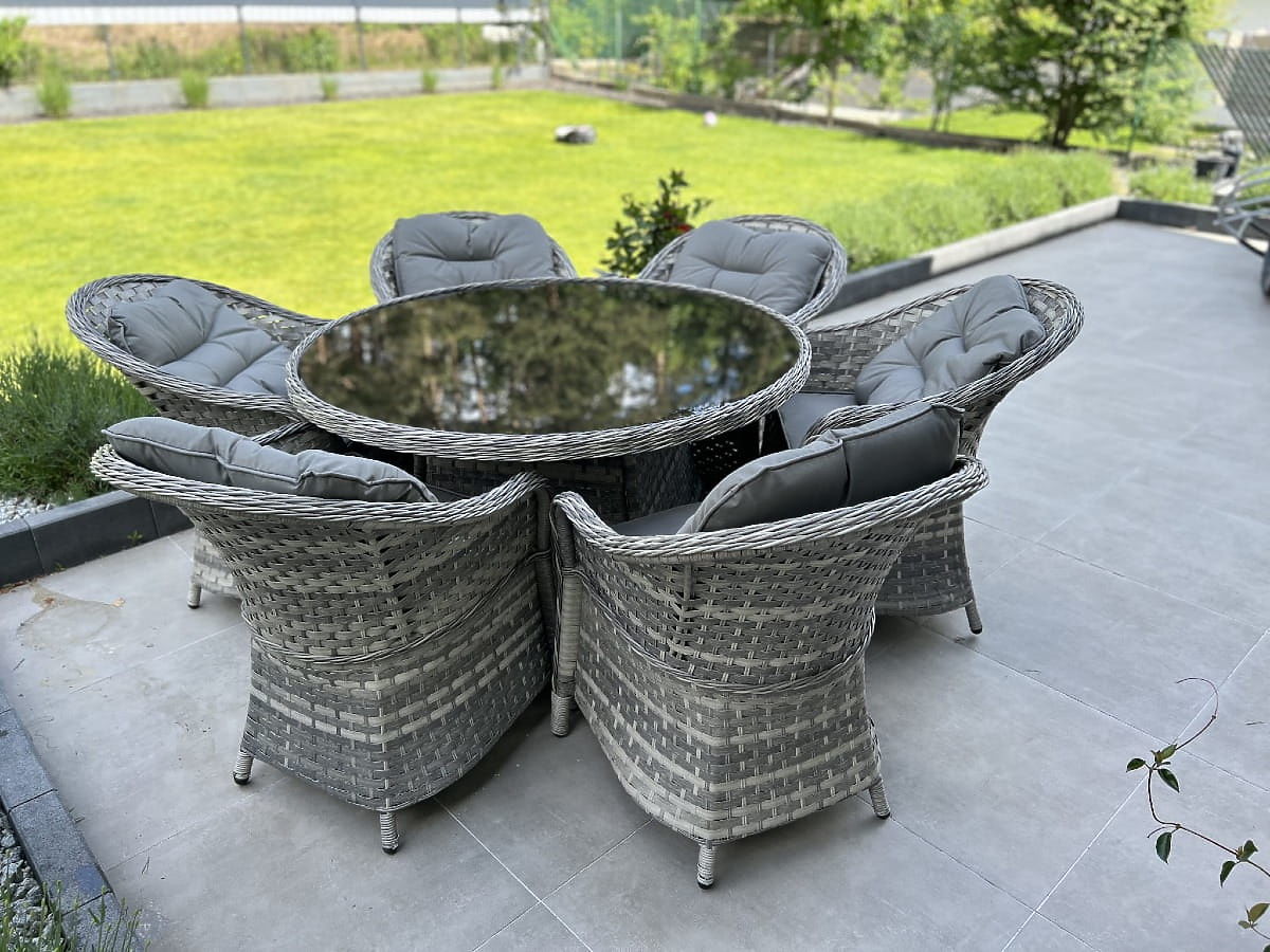 A MODERNO étkezőgarnitúra a modern design és az innováció esszenciája a kültéri és beltéri bútorok terén. A legújabb design és funkcionalitás egyedülálló kombinációját kínálja, ez a garnitúra minden tér szívévé válik. A kollekció székekből és asztalból áll, amelyek kiváló minőségű szintetikus rattanból készültek, biztosítva az abszolút ellenállást az időjárás káros hatásaival szemben, garantálva ezzel a hosszú élettartamot és tartósságot. A legmagasabb minőségű anyagok kiválasztása teszi a MODERNO GRANDE-t ideálissá a legigényesebb vásárlók számára, akik nemcsak szépséget, hanem praktikusságot és tartósságot is keresnek az étkezőbútoraikban. Ez a garnitúra ideális megoldás azok számára, akik eleganciát és modernséget szeretnének ötvözni életterükben. A garnitúra színe: világosszürke melír, nem egységes. A párnák színe: sötétszürke. Fonat: lapos technorattan 17mm x 1,2mm és kerek technorattan, sima szerkezet. Szerkezet: acél. A garnitúra 7 elemből áll: 6 x szék: szélesség: 56 cm, mélység: 70 cm, magasság: 81 cm, 1 x asztal (5mm-es biztonsági üveglappal): átmérő: 120 cm, magasság: 74 cm. További méretek: A szék ülésmagassága: 38 cm + 5 cm párna. A háttámla magassága az üléstől: 50 cm. A karfa és a háttámla szélessége: 5 cm. Az ülés szélessége és mélysége: 52 x 52 cm. A garnitúra 1 raklapon kerül szállításra, méretei: 145x125x210 cm, súlya 90 kg. A sötétszürke színű párnák az ülőfelülethez a garnitúra árában benne vannak (6 db). Mindegyik levehető cipzáras huzattal rendelkezik, amely kültéri anyagból (100% poliészter) készült, és alacsony hőmérsékleten mosható. A párnahuzatok kiváló minőségű teflon bevonatú szövetből készültek, amely védi őket a nedvességtől. A párnák töltete kiváló minőségű kárpitozott habból készült (közepesen kemény - T25), amely megakadályozza a deformációt. A párnák vastagsága: 5 cm. Lehetőség van egyedi rendelésre készült párnák varrására ehhez a garnitúrához: https://www.bg-meble.pl/pl/p/Usluga-Krawiecka-Poduszki-Na-Zamowienie-/742. Lehetőség van egyedi rendelésre készült párnahuzatok varrására ehhez a garnitúrához: https://www.bg-meble.pl/pl/p/Usluga-Krawiecka-Poszewki-Na-Zamowienie/743. A bútor változatlan megjelenésének hosszabb megőrzése érdekében javasoljuk védőburkolat vásárlását. A sötétszürke színű burkolat egyrészes és alul húzózsinórral rendelkezik. Minden burkolat rendelésre készül, a szállítási idő körülbelül 14 munkanap. Képzeljen el egy kerti bútort, amely minden szempontból meghaladja az elvárásait – az ellenállóságtól a designig. Itt van a BELLO GIARDINO, ahol minden részlet számít, és a luxus találkozik a funkcionalitással: Változatlan minőség: A szintetikus rattanunk garancia arra, hogy a bútor évekig tart, anélkül, hogy veszítene szépségéből vagy tartósságából. Időjárásállóság: Bútoraink a legkeményebb időjárási körülményeknek is ellenállnak, a perzselő naptól a fagyos telekig, mindig gyönyörűek maradnak. Luxus kényelem: Vastag, puha párnák hívogatnak a pihenésre, olyan kényelmet kínálva, amelyet máshol nehéz megtalálni. Könnyedség és tartósság: Az alumínium szerkezet a legjobbat ötvözi a két világból – könnyű, de rendkívül stabil. Dizájn, amely elbűvöl: Bútoraink minden eleme esztétikai és funkcionális szempontok figyelembevételével készült, hogy minden környezetbe illeszkedjen. Akár a minimalizmus szerelmese, akár a gazdag, elegáns elrendezéseket értékeli, bútoraink megfelelnek az elvárásainak, túllépve a szokásos funkcionalitás és esztétika határait. Biztosítjuk, hogy a legellenállóbb vásárlók sem tudnak ellenállni a BELLO GIARDINO által kínált kényelemnek és stílusnak. Tegye kertjét, teraszát vagy erkélyét a relaxáció és elegancia oázisává, amelyet mindig is szeretett volna. Ne várjon, fedezze fel a BELLO GIARDINO-t még ma, és alakítsa át kültéri tereit azzá, amiről mindig is álmodott.