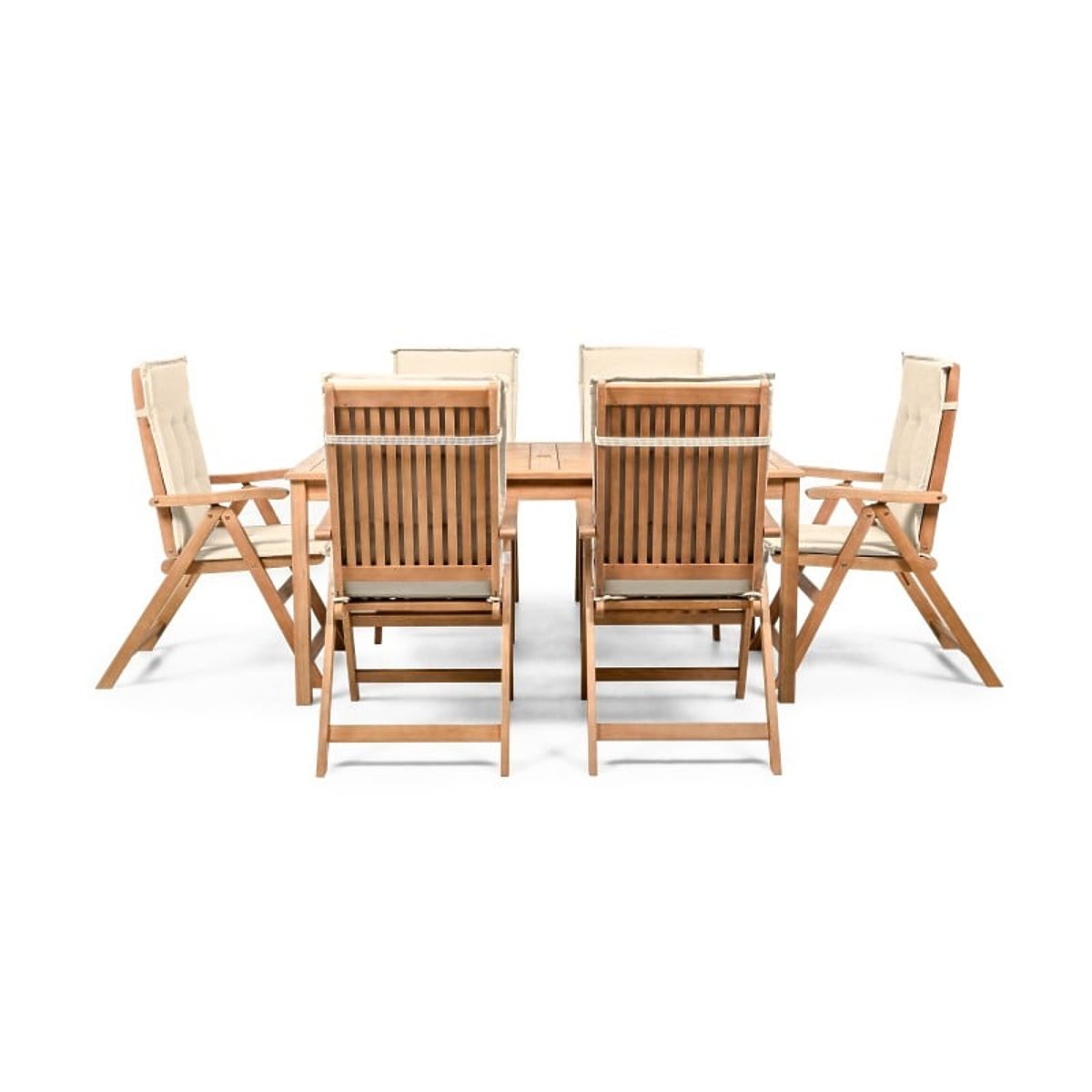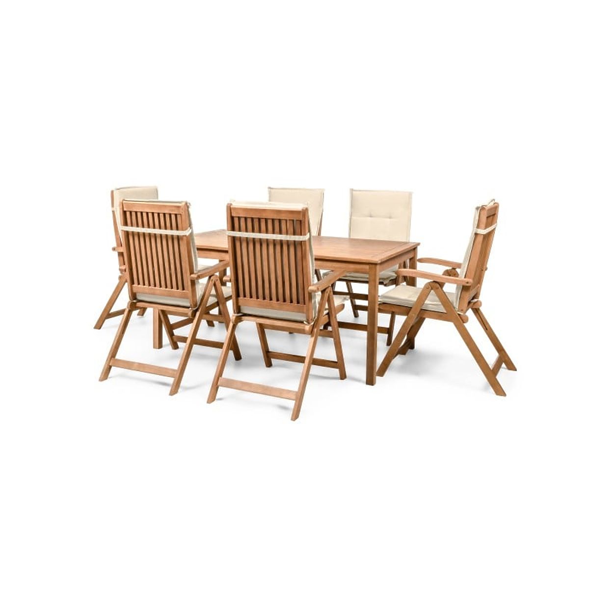 Lukahome.hu » Kerti bútorok / Kerti szettek / Kerti szett Familis asztal 160 cm + 6 szék állítható háttámlával és krémszínű párnákkal, fa