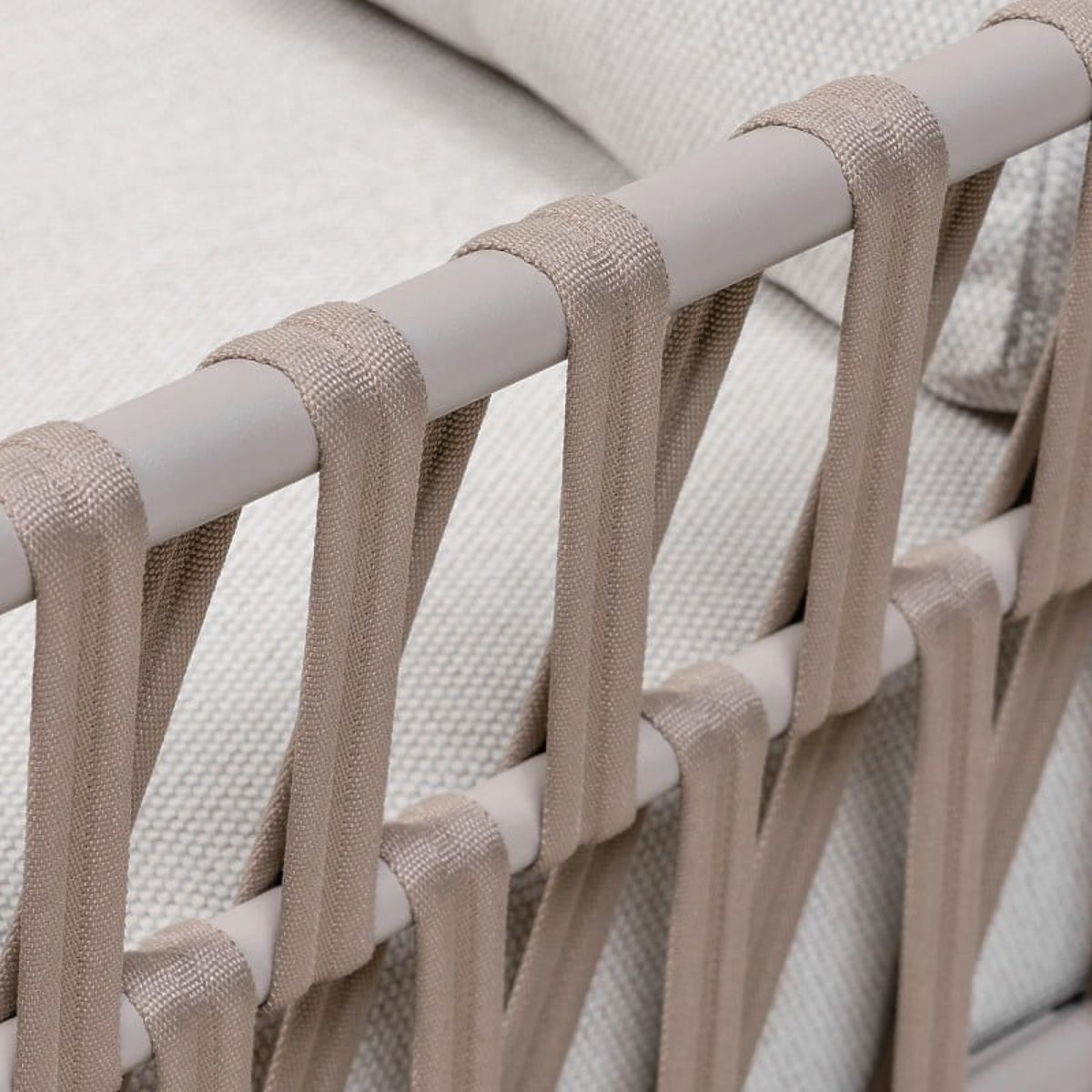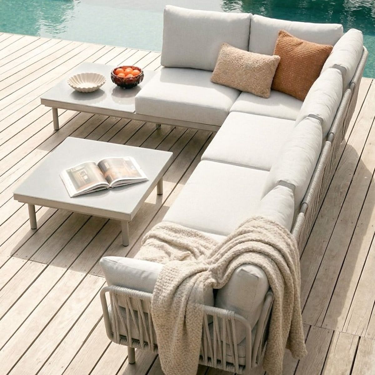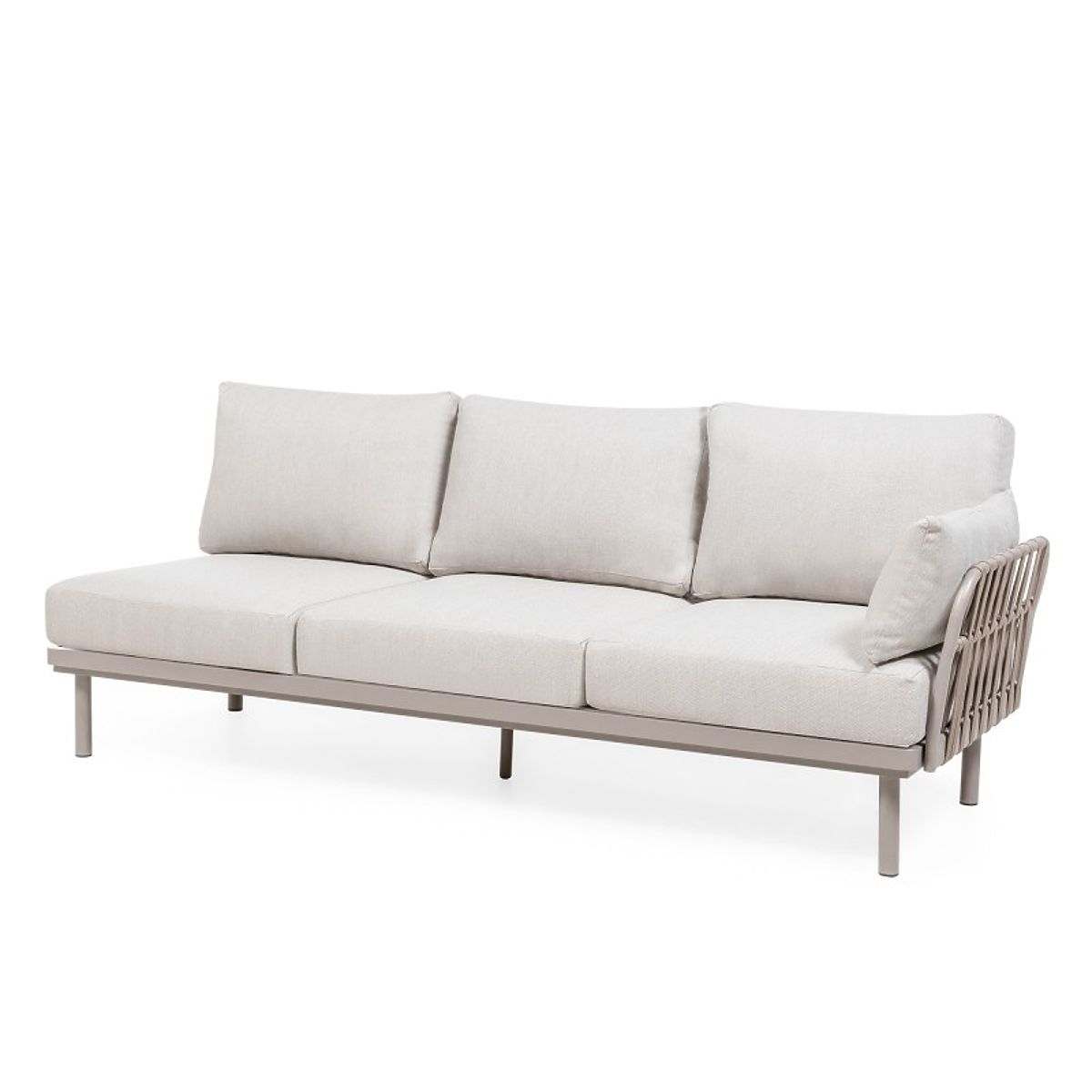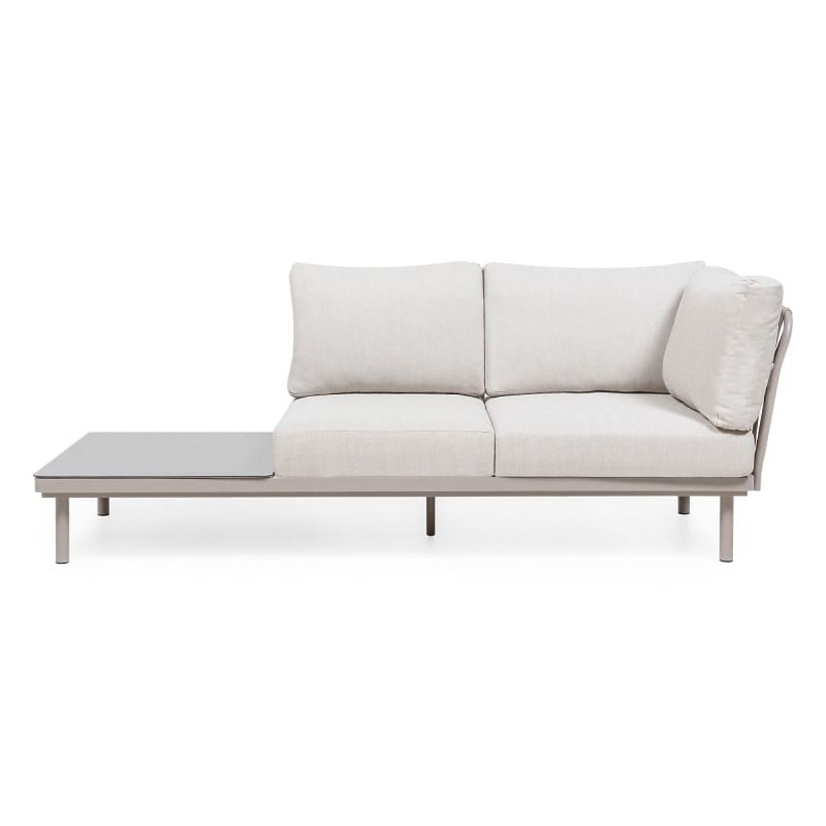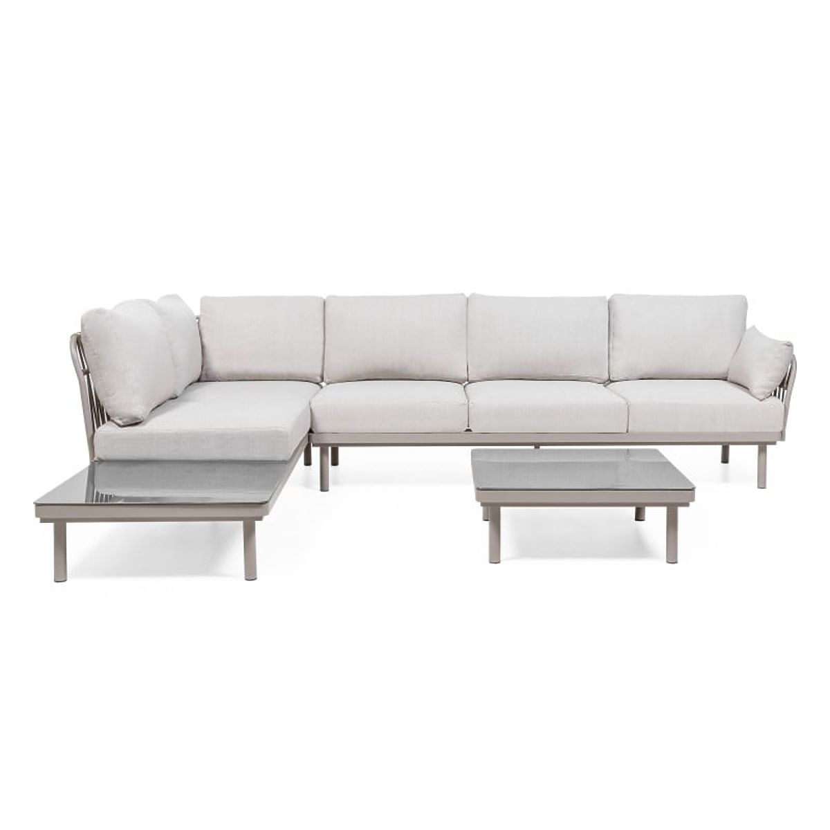 Amarello sarokkanapé – finom elegancia harmonikus formában. Bézsszürke árnyalatú alumínium szerkezet, tartós fonás és kényelmes párnák alkotják a kifinomult pihenőteret, amelyet praktikus asztal és oldalsó polc egészít ki.