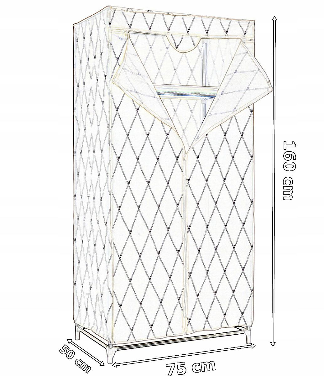 A szekrény acélkeretekből készült, amelyek a vázát alkotják. A keretre légáteresztő, minőségi anyag van felhúzva nyomtatással. Könnyen karbantartható és praktikus, a polc ideális sapkák, sálak, kesztyűk vagy más apró tárgyak tárolására. A szekrény fő részében lehetőség van ruhák vállfára akasztására is. Könnyű és erős szerkezet, amelyet bármikor összehajthat, szállíthat vagy áthelyezhet.